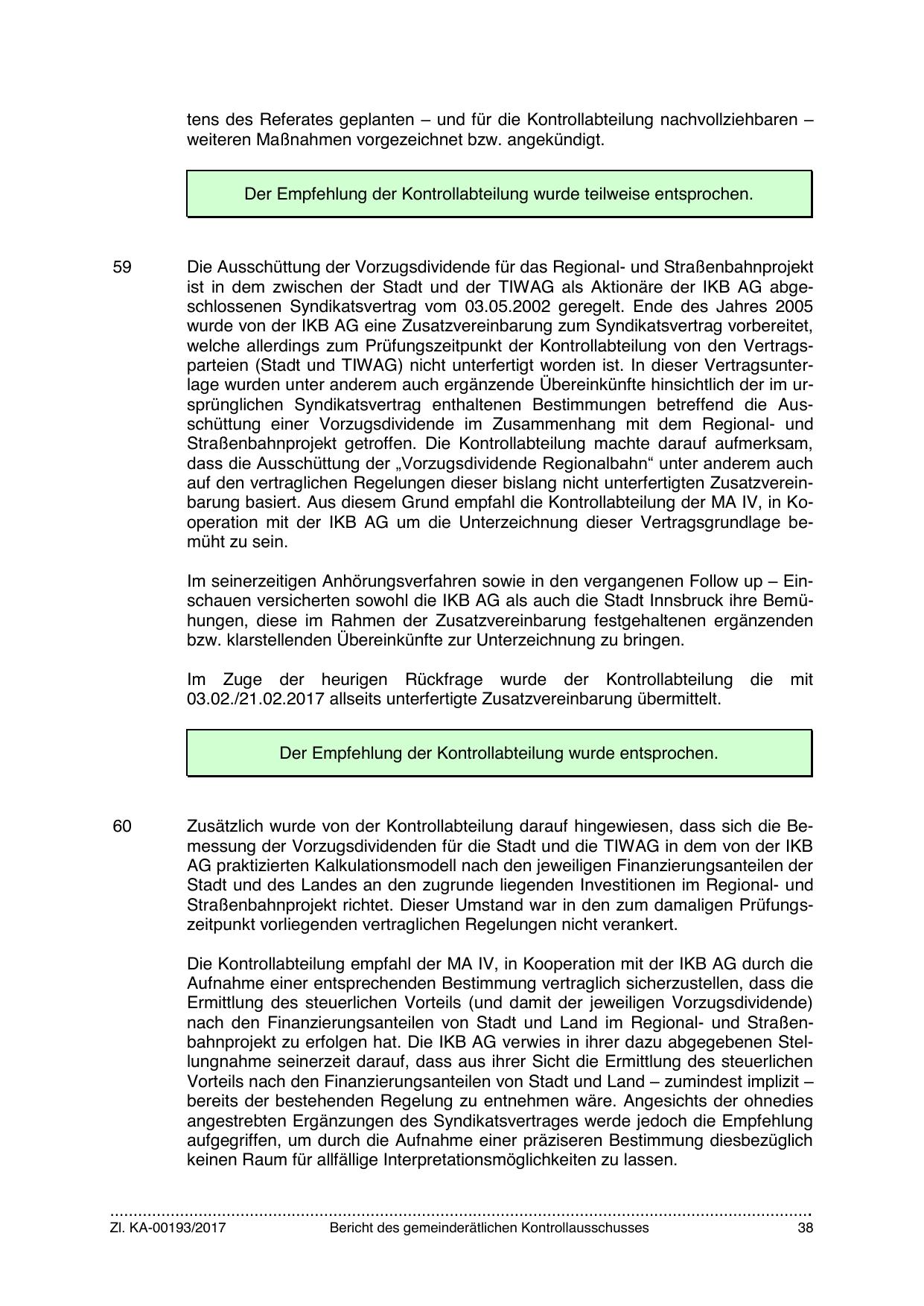 Zusätzlich wurde von der Kontrollabteilung darauf hingewiesen, dass sich die Bemessung der Vorzugsdividenden für die Stadt und die TIWAG in dem von der IKB