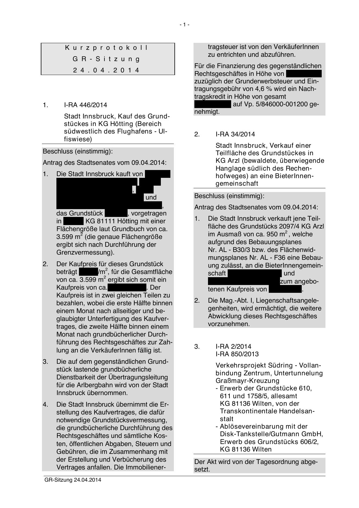 Stadt Innsbruck, Kauf des Grundstückes in KG Hötting (Bereich