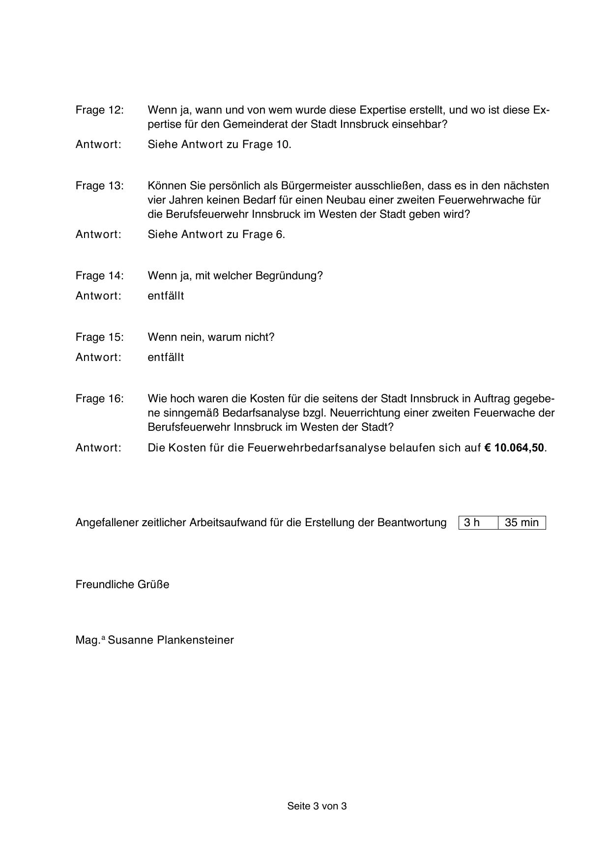 Wie hoch waren die Kosten für die seitens der Stadt Innsbruck in Auftrag gegebene sinngemäß Bedarfsanalyse bzgl. Neuerrichtung einer zweiten Feuerwache der