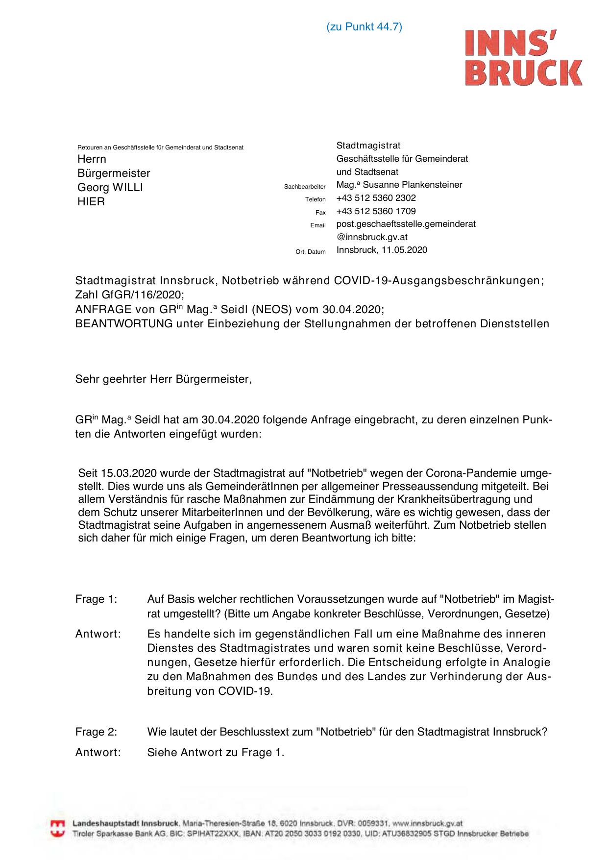 GRin Mag.a Seidl hat am 30.04.2020 folgende Anfrage eingebracht, zu deren einzelnen Punkten die Antworten eingefügt wurden: