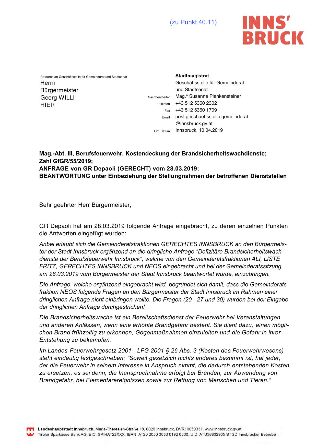 am 28.03.2019 vom Bürgermeister der Stadt Innsbruck beantwortet wurde, einzubringen.