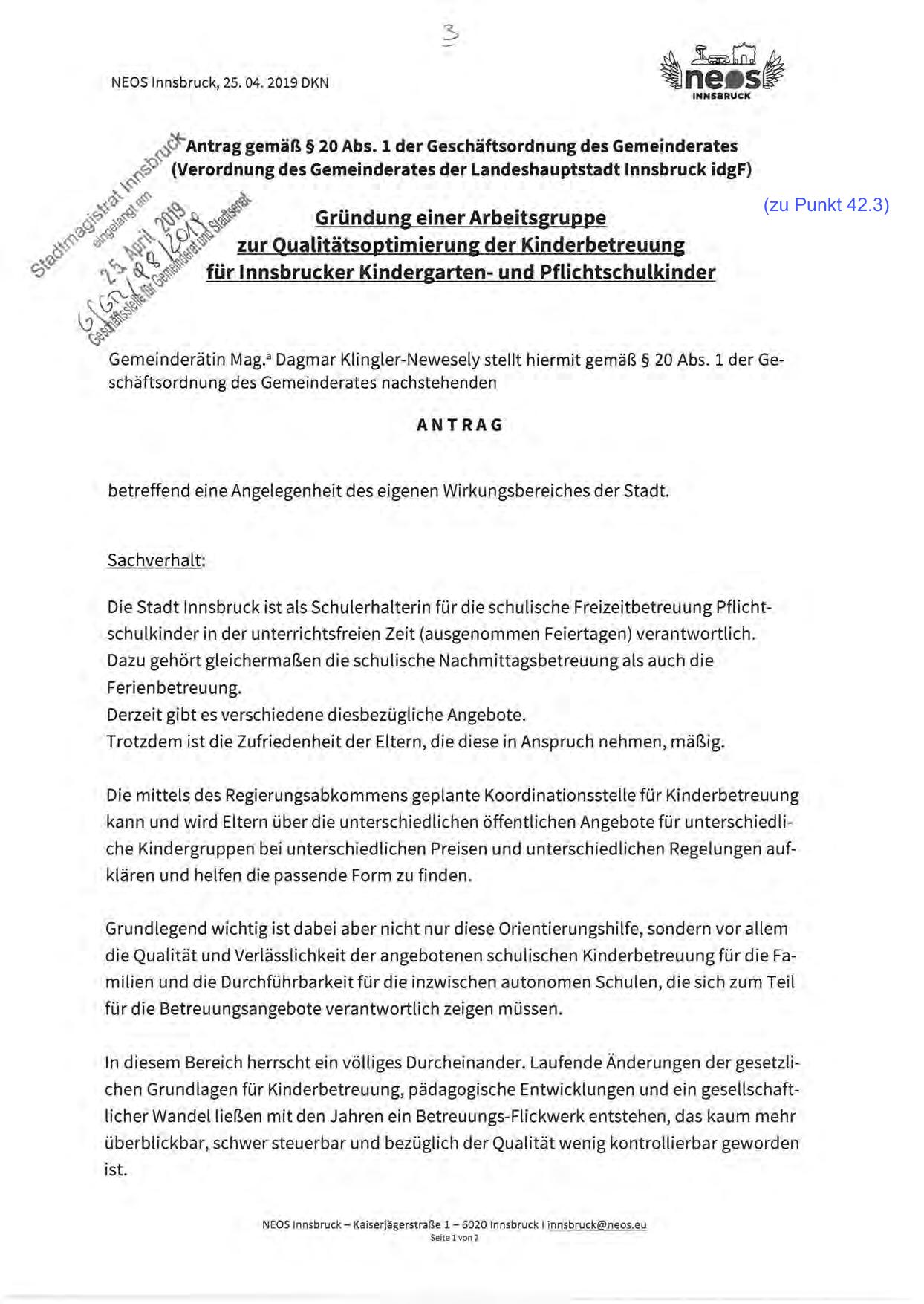 Gemeinderätin Mag.a Dagmar Klingler-Newesely stellt hiermit gemäß§ 20 Abs. 1 der Geschäftsordnung des Gemeinderates nachstehenden