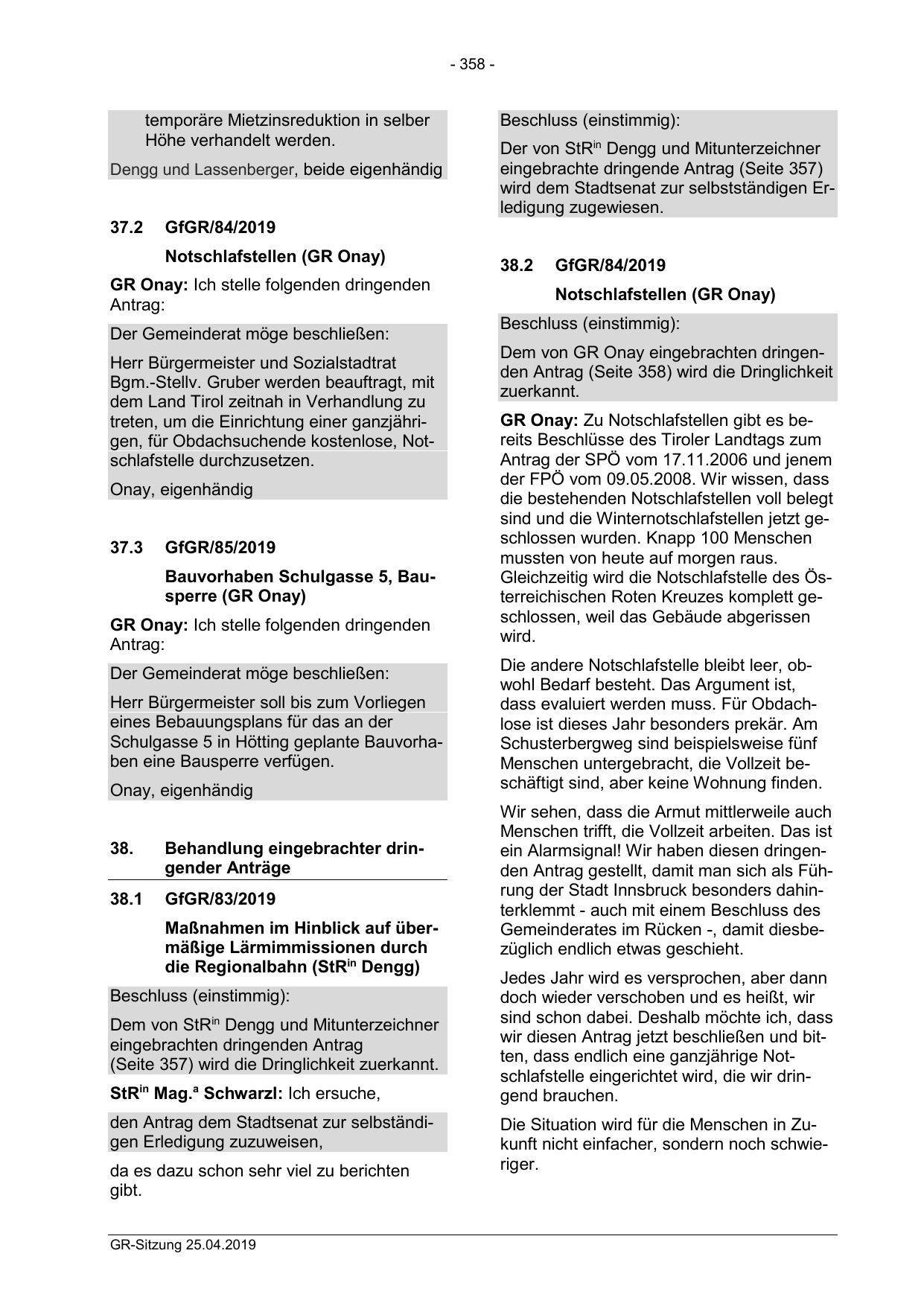 Dem von GR Onay eingebrachten dringenden Antrag (Seite 358) wird die Dringlichkeit
