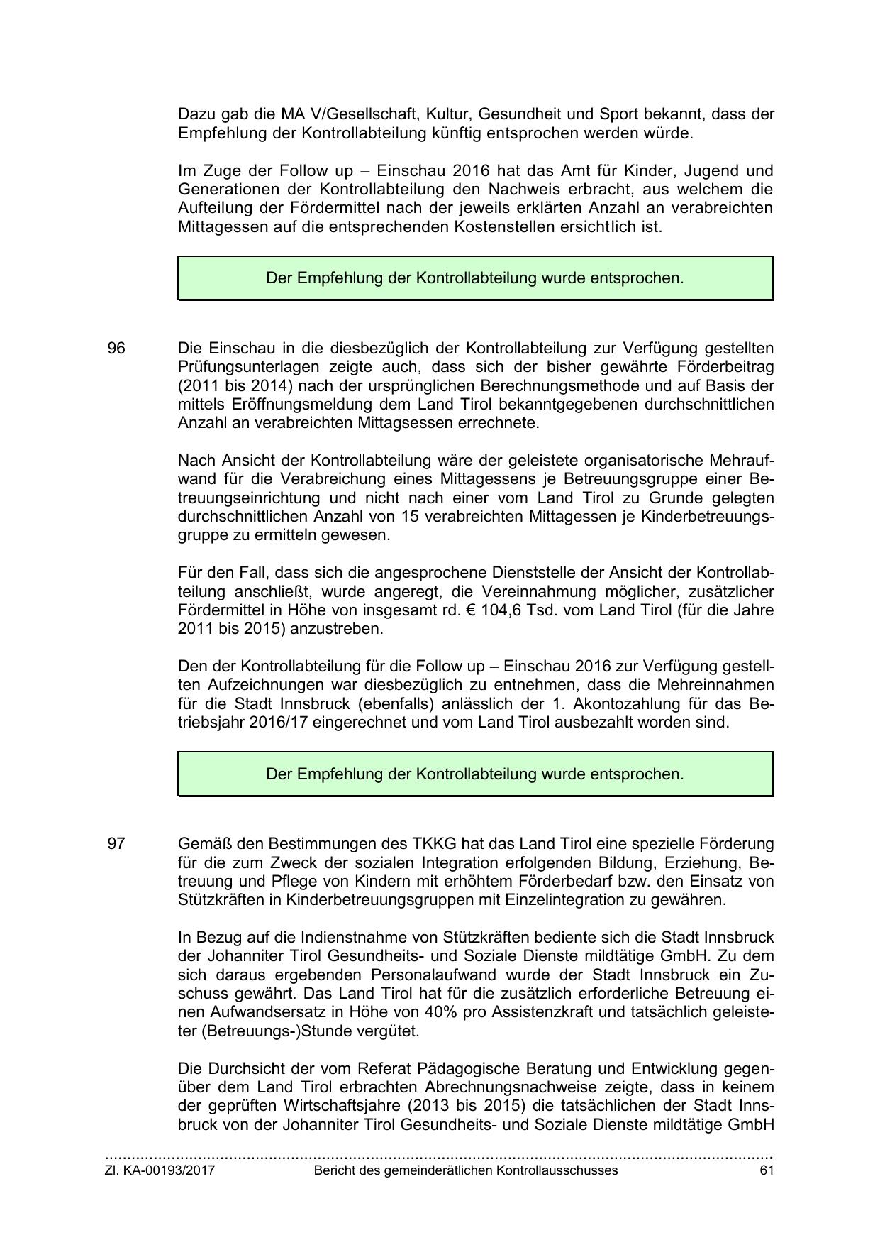 Nach Ansicht der Kontrollabteilung wäre der geleistete organisatorische Mehraufwand für die Verabreichung eines Mittagessens je Betreuungsgruppe einer Betreuungseinrichtung und nicht nach einer vom Land Tirol zu Grunde gelegten