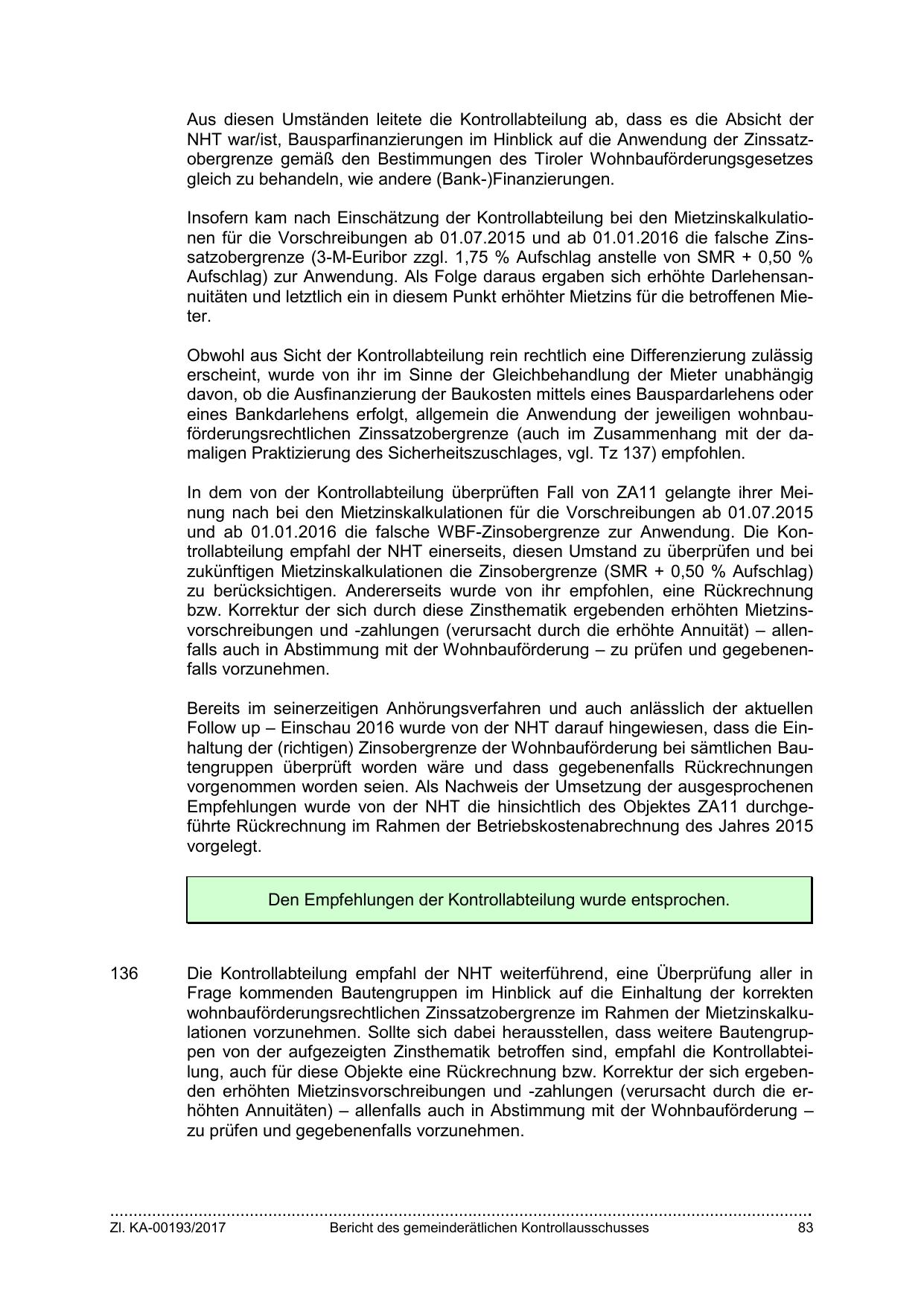 wohnbauförderungsrechtlichen Zinssatzobergrenze im Rahmen der Mietzinskalkulationen vorzunehmen. Sollte sich dabei herausstellen, dass weitere Bautengruppen von der aufgezeigten Zinsthematik betroffen sind, empfahl die Kontrollabteilung, auch für diese Objekte eine Rückrechnung bzw. Korrektur der sich ergebenden erhöhten Mietzinsvorschreibungen und -zahlungen (verursacht durch die erhöhten Annuitäten) – allenfalls auch in Abstimmung mit der Wohnbauförderung –