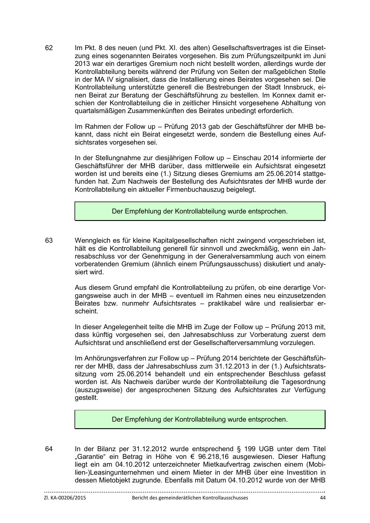 Im Rahmen der Follow up – Prüfung 2013 gab der Geschäftsführer der MHB bekannt, dass nicht ein Beirat eingesetzt werde, sondern die Bestellung eines Aufsichtsrates vorgesehen sei.