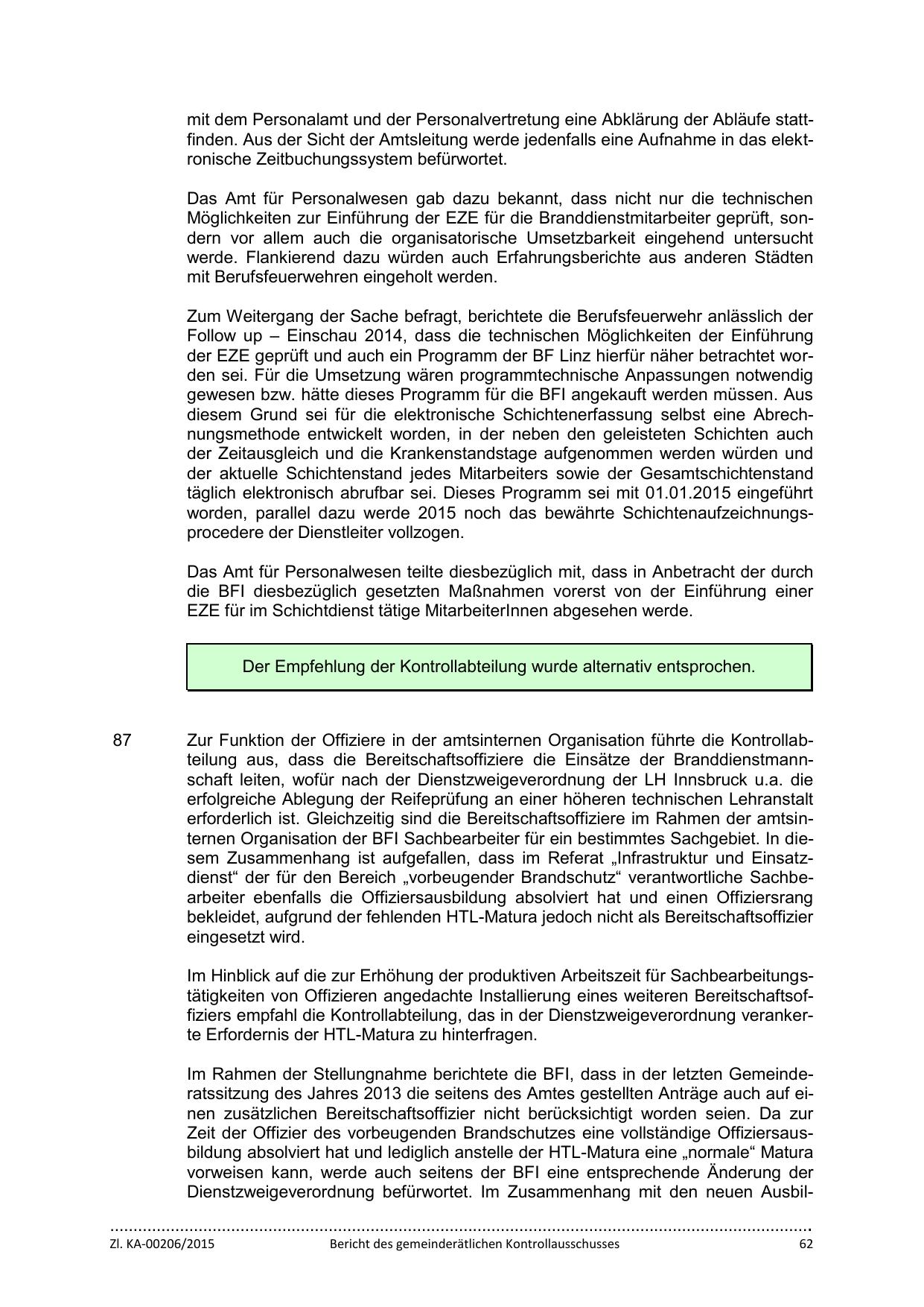 Im Rahmen der Stellungnahme berichtete die BFI, dass in der letzten Gemeinderatssitzung des Jahres 2013 die seitens des Amtes gestellten Anträge auch auf einen zusätzlichen Bereitschaftsoffizier nicht berücksichtigt worden seien. Da zur