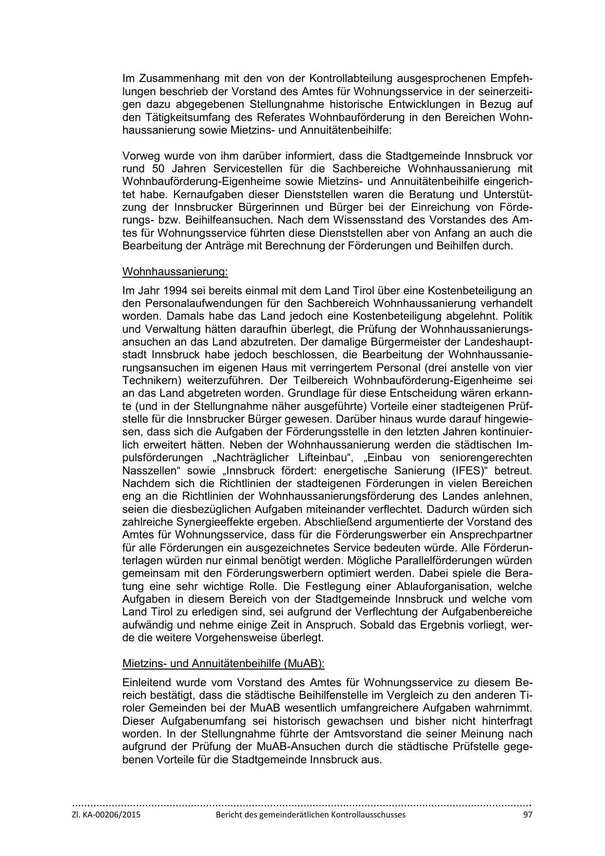 an das Land abgetreten worden. Grundlage für diese Entscheidung wären erkannte (und in der Stellungnahme näher ausgeführte) Vorteile einer stadteigenen Prüfstelle für die Innsbrucker Bürger gewesen. Darüber hinaus wurde darauf hingewiesen, dass sich die Aufgaben der Förderungsstelle in den letzten Jahren kontinuierlich erweitert hätten. Neben der Wohnhaussanierung werden die städtischen Impulsförderungen „Nachträglicher Lifteinbau“, „Einbau von seniorengerechten
