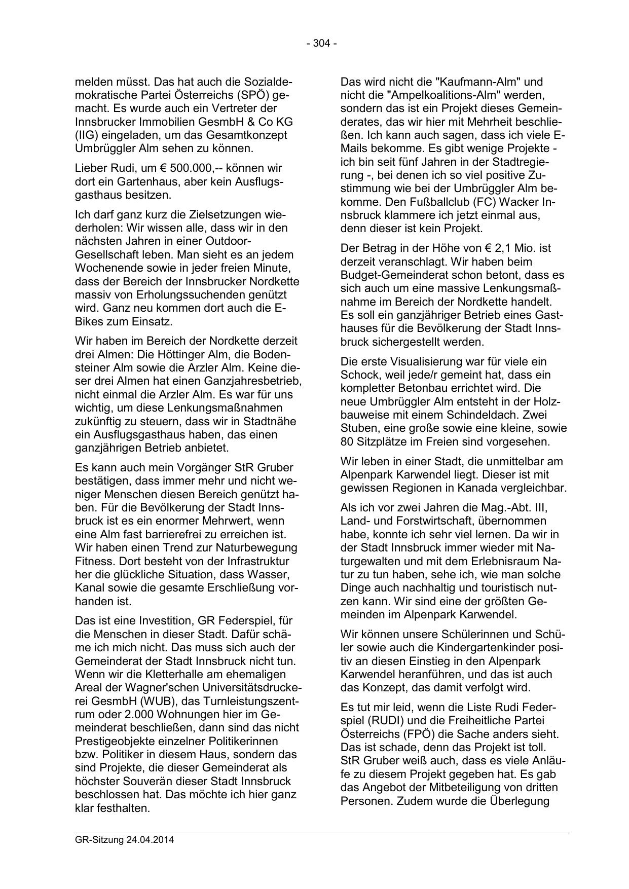 sondern das ist ein Projekt dieses Gemeinderates, das wir hier mit Mehrheit beschließen. Ich kann auch sagen, dass ich viele EMails bekomme. Es gibt wenige Projekte ich bin seit fünf Jahren in der Stadtregierung -, bei denen ich so viel positive Zustimmung wie bei der Umbrüggler Alm bekomme. Den Fußballclub (FC) Wacker Innsbruck klammere ich jetzt einmal aus,
