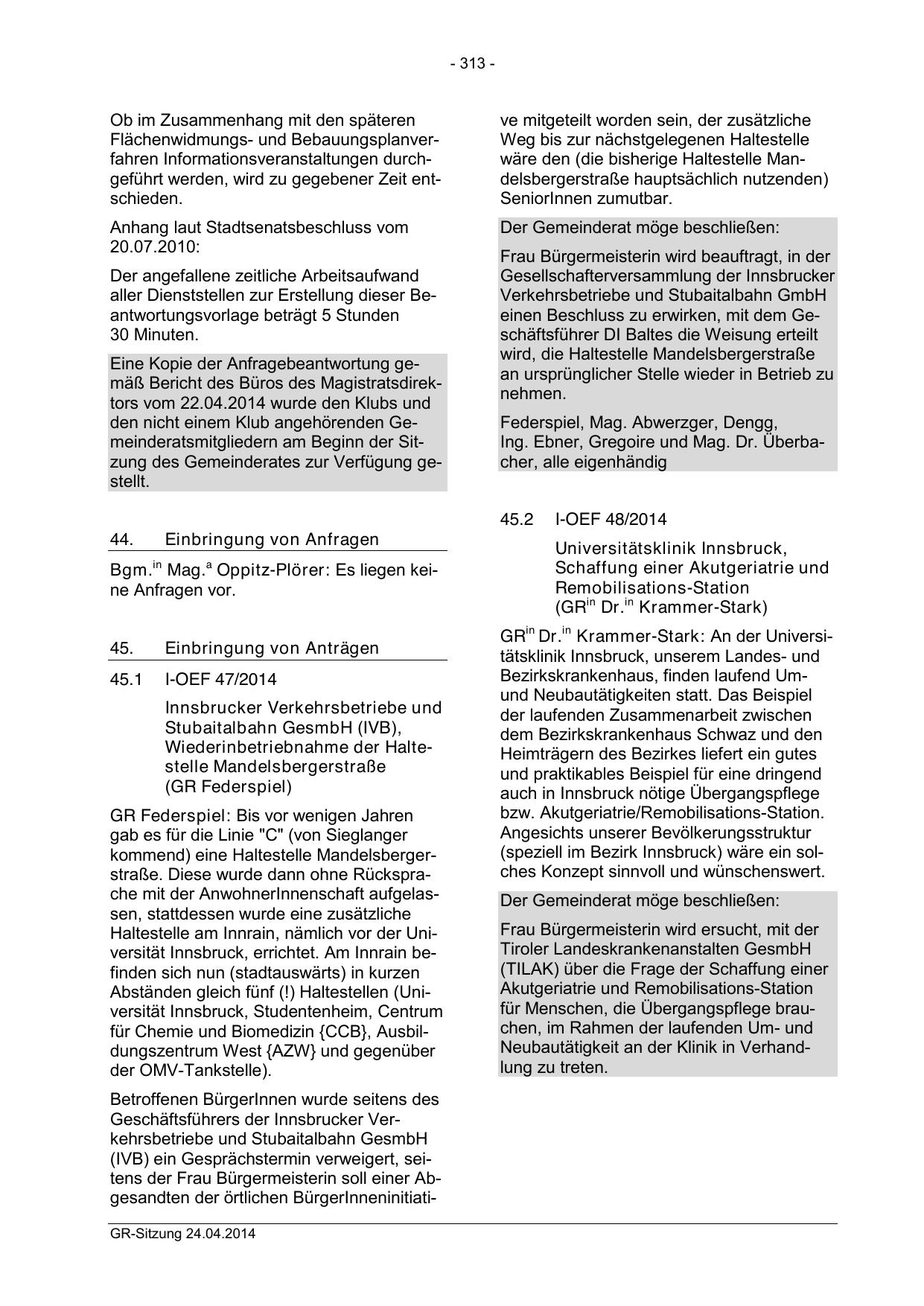 (IVB) ein Gesprächstermin verweigert, seitens der Frau Bürgermeisterin soll einer Abgesandten der örtlichen BürgerInneninitiatiGR-Sitzung 24.04.2014
