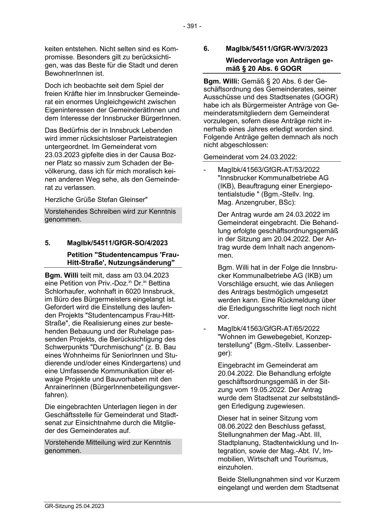 Gemeinderat eingebracht. Die Behandlung erfolgte geschäftsordnungsgemäß