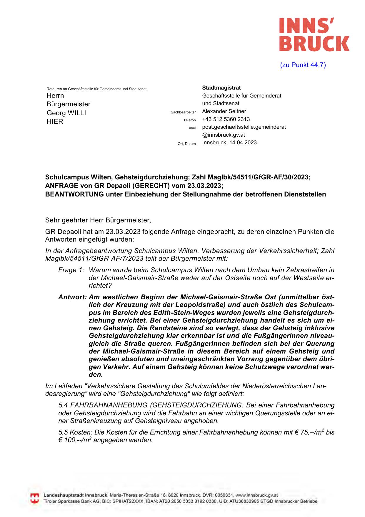 In der Anfragebeantwortung Schulcampus Wilten, Verbesserung der Verkehrssicherheit; Zahl