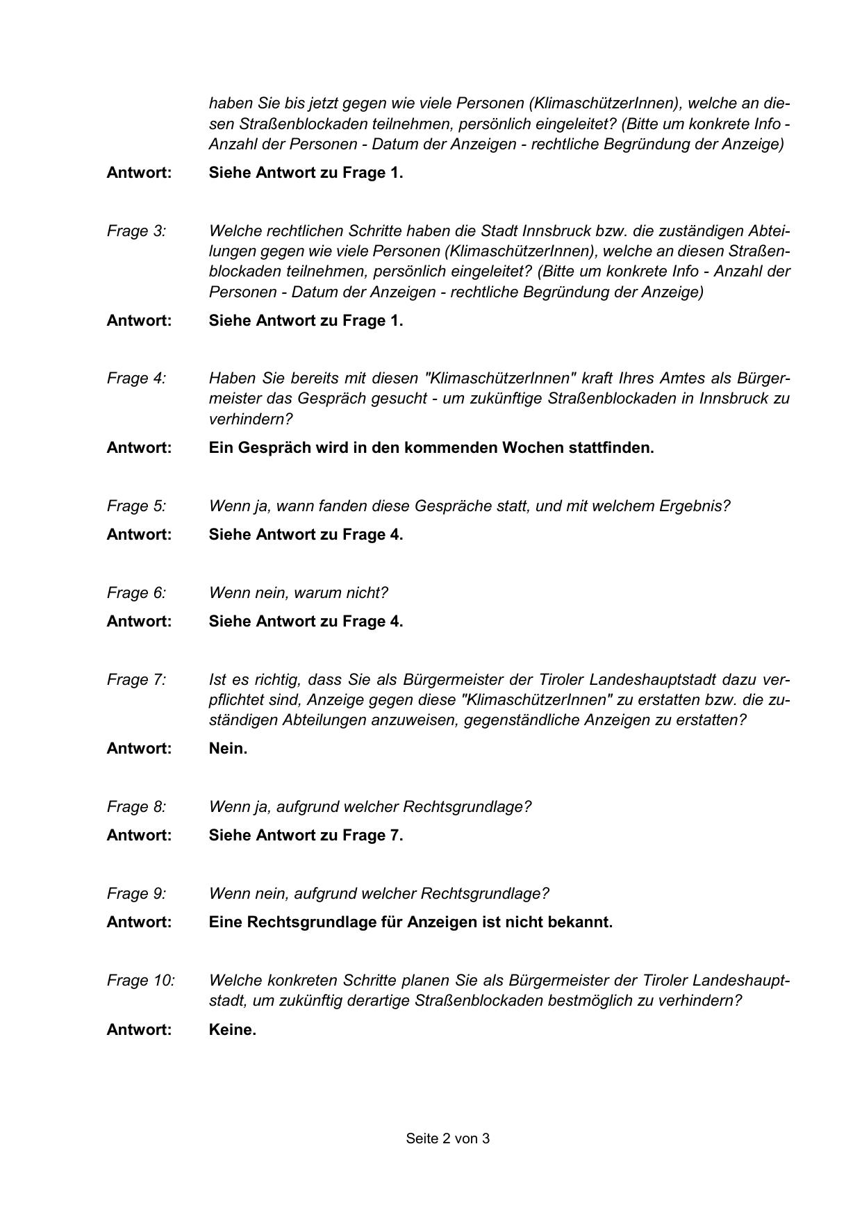 Haben Sie bereits mit diesen "KlimaschützerInnen" kraft Ihres Amtes als Bürgermeister das Gespräch gesucht - um zukünftige Straßenblockaden in Innsbruck zu