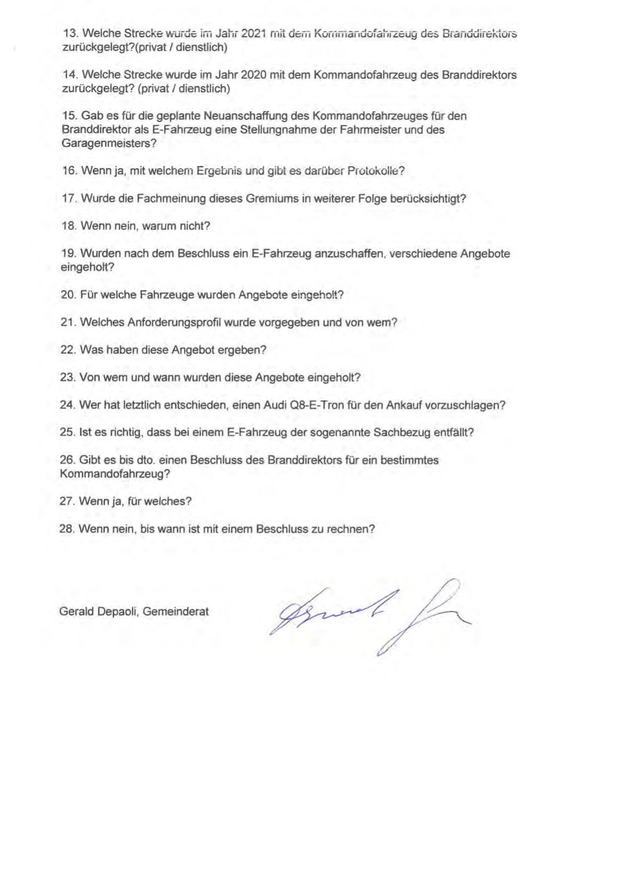 15. Gab es für die geplante Neuanschaffung des Kommandofahrzeuges für den