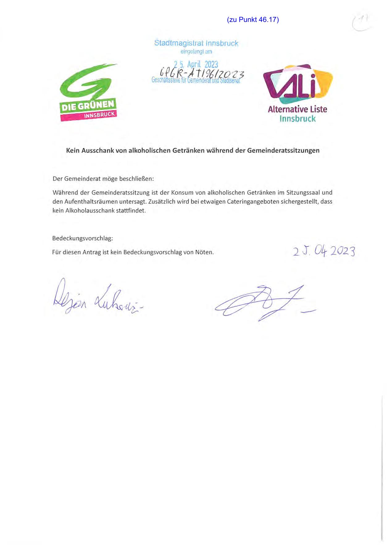 Während der Gemeinderatssitzung ist der Konsum von alkoholischen Getränken im Sitzungssaal und