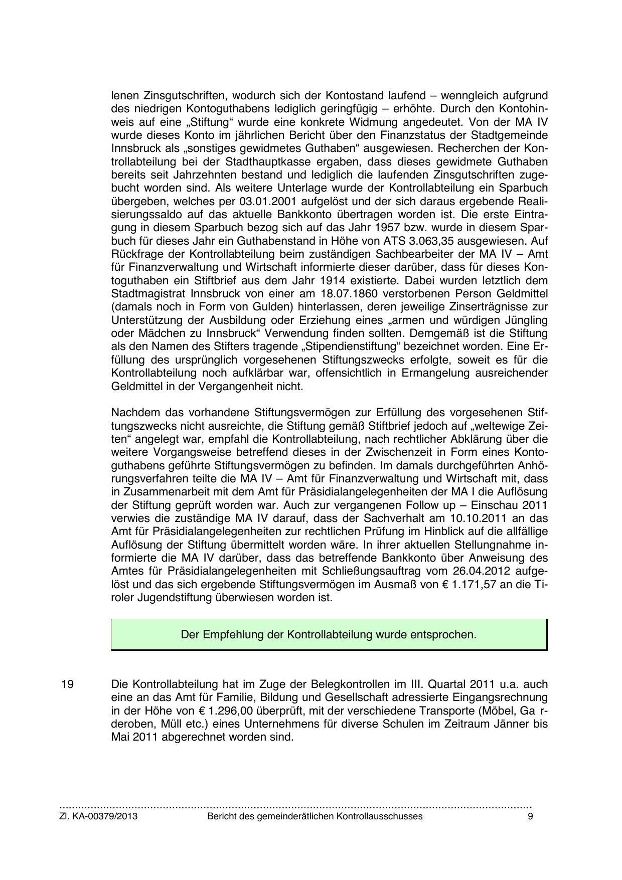 Innsbruck als „sonstiges gewidmetes Guthaben“ ausgewiesen. Recherchen der Kontrollabteilung bei der Stadthauptkasse ergaben, dass dieses gewidmete Guthaben
