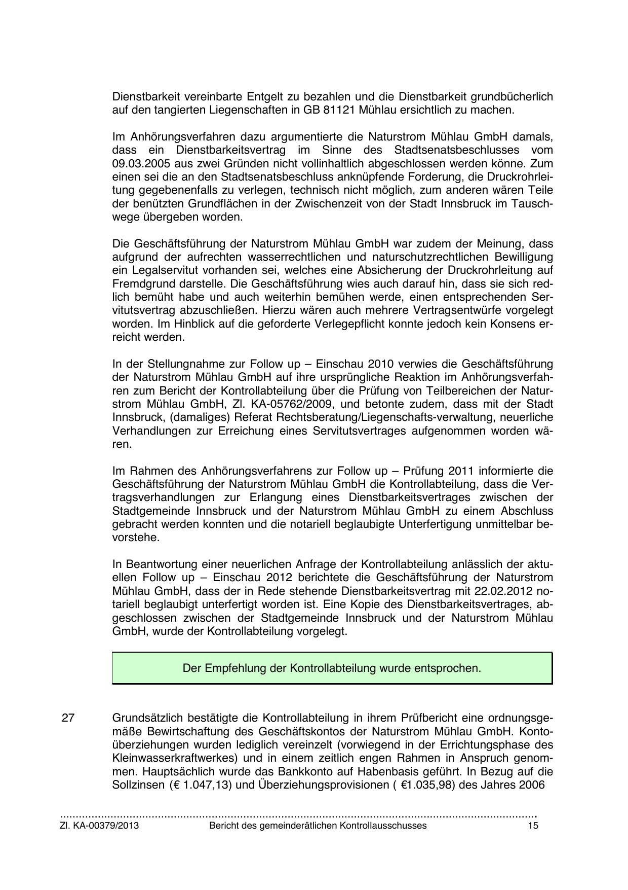 Geschäftsführung der Naturstrom Mühlau GmbH die Kontrollabteilung, dass die Vertragsverhandlungen zur Erlangung eines Dienstbarkeitsvertrages zwischen der