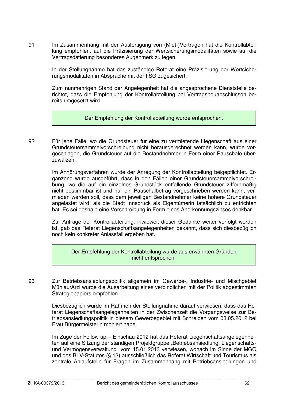 Zum nunmehrigen Stand der Angelegenheit hat die angesprochene Dienststelle berichtet, dass die Empfehlung der Kontrollabteilung bei Vertragsneuabschlüssen bereits umgesetzt wird.