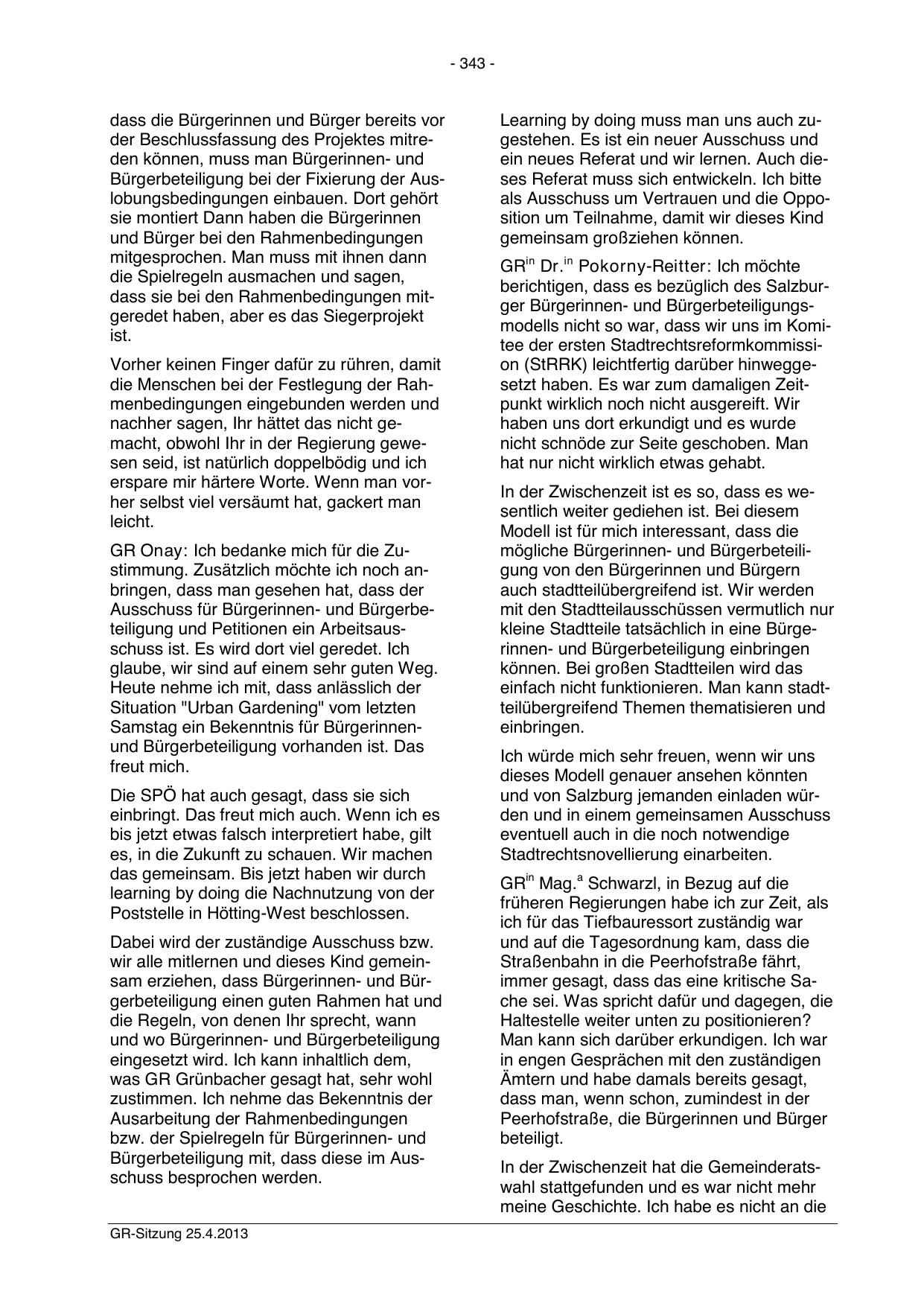 berichtigen, dass es bezüglich des Salzburger Bürgerinnen- und Bürgerbeteiligungsmodells nicht so war, dass wir uns im Komitee der ersten Stadtrechtsreformkommission (StRRK) leichtfertig darüber hinweggesetzt haben. Es war zum damaligen Zeitpunkt wirklich noch nicht ausgereift. Wir