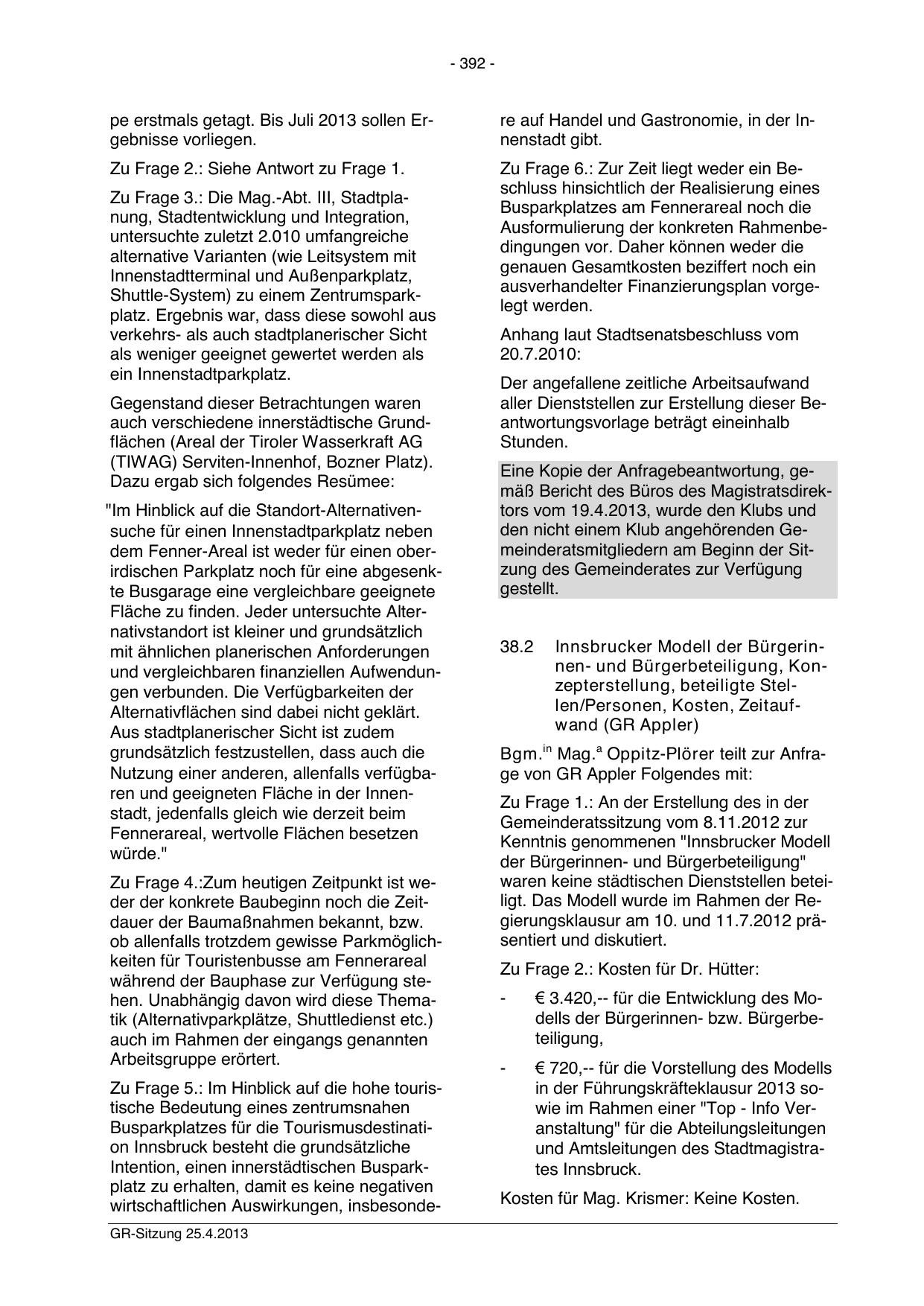 Innsbrucker Modell der Bürgerinnen- und Bürgerbeteiligung, Konzepterstellung, beteiligte Stellen/Personen, Kosten, Zeitaufwand (GR Appler)