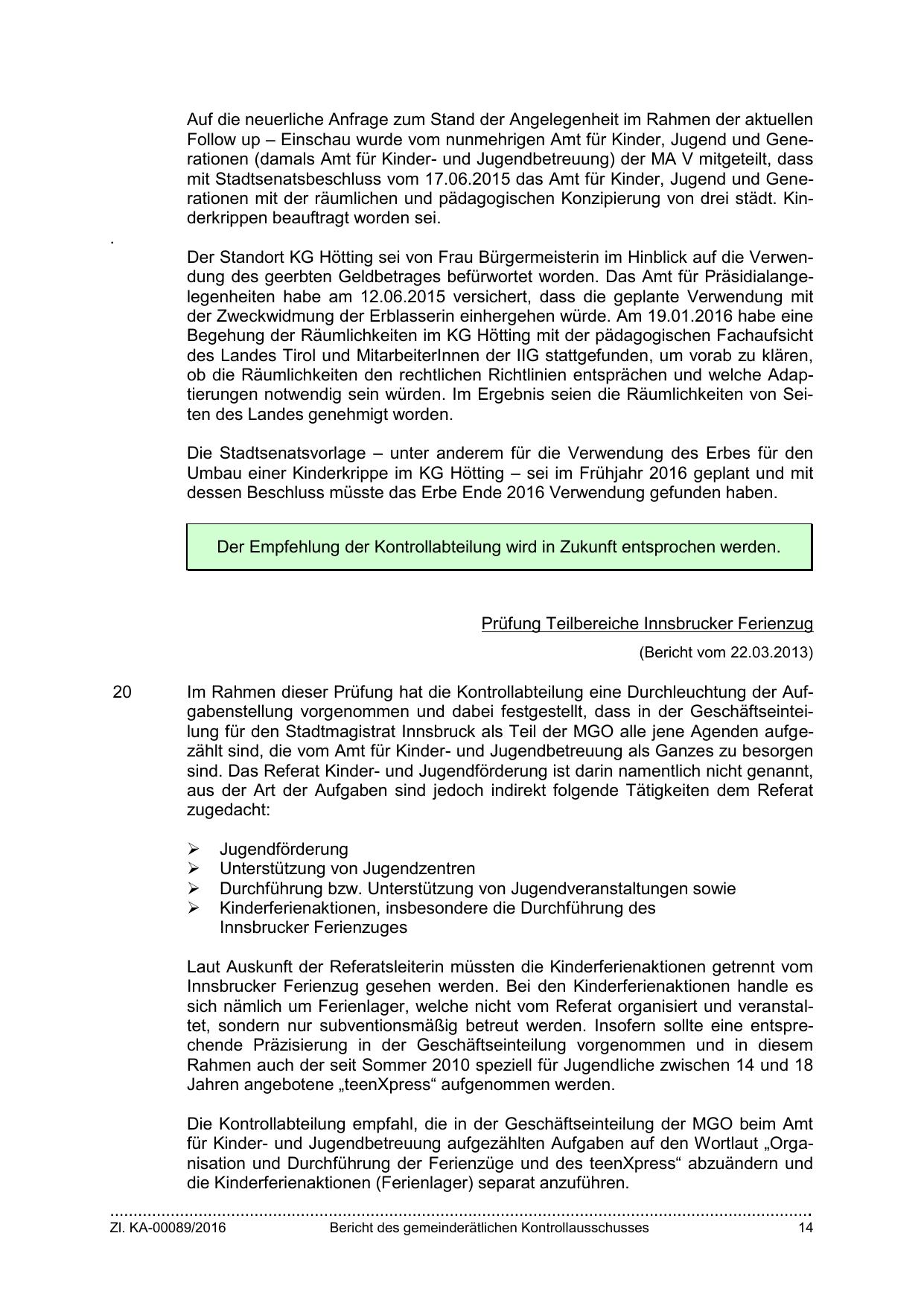 Follow up – Einschau wurde vom nunmehrigen Amt für Kinder, Jugend und Generationen (damals Amt für Kinder- und Jugendbetreuung) der MA V mitgeteilt, dass