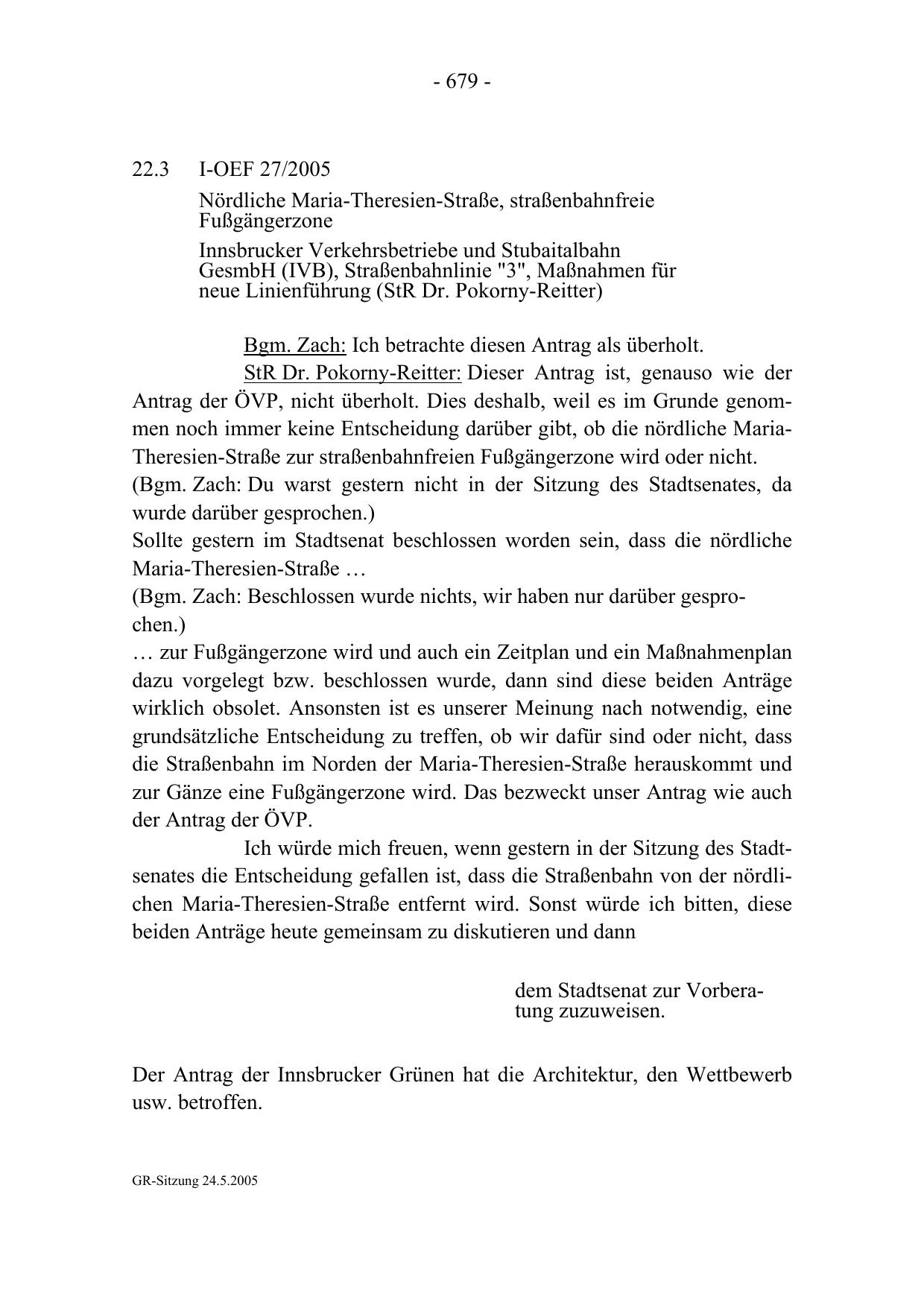 Antrag der ÖVP, nicht überholt. Dies deshalb, weil es im Grunde genommen noch immer keine Entscheidung darüber gibt, ob die nördliche MariaTheresien-Straße zur straßenbahnfreien Fußgängerzone wird oder nicht.