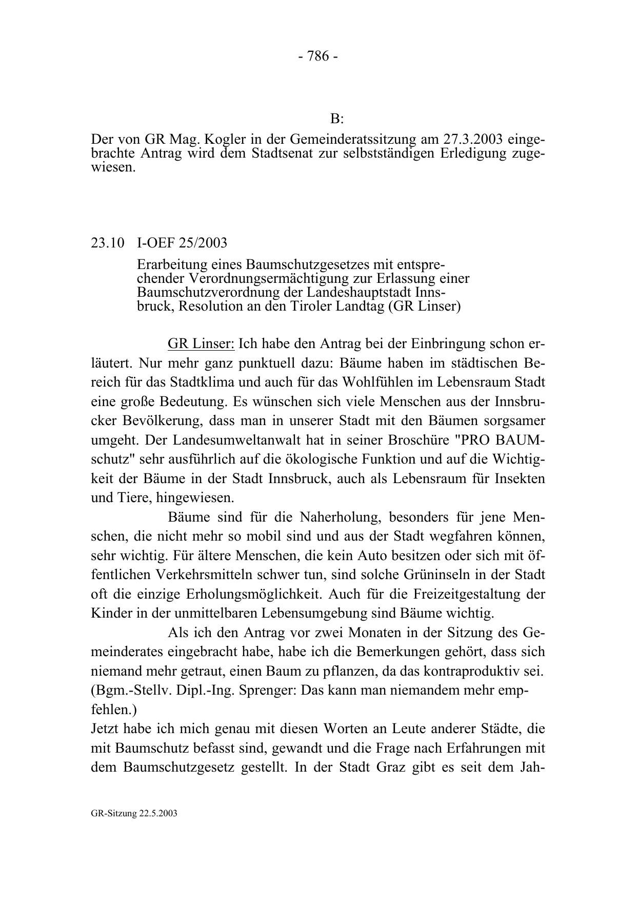 dem Baumschutzgesetz gestellt. In der Stadt Graz gibt es seit dem JahGR-Sitzung 22.5.2003