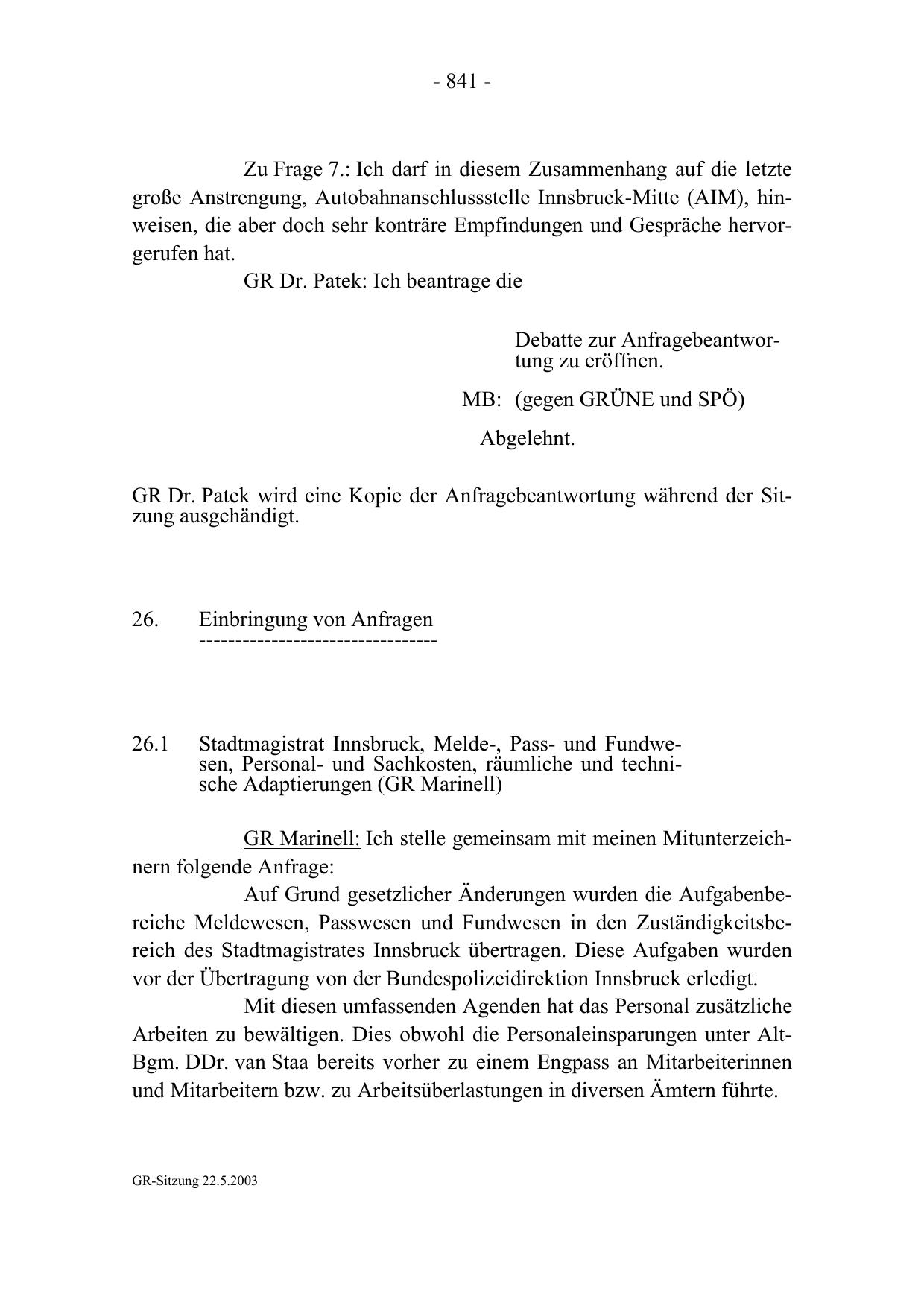 Stadtmagistrat Innsbruck, Melde-, Pass- und Fundwesen, Personal- und Sachkosten, räumliche und technische Adaptierungen (GR Marinell)