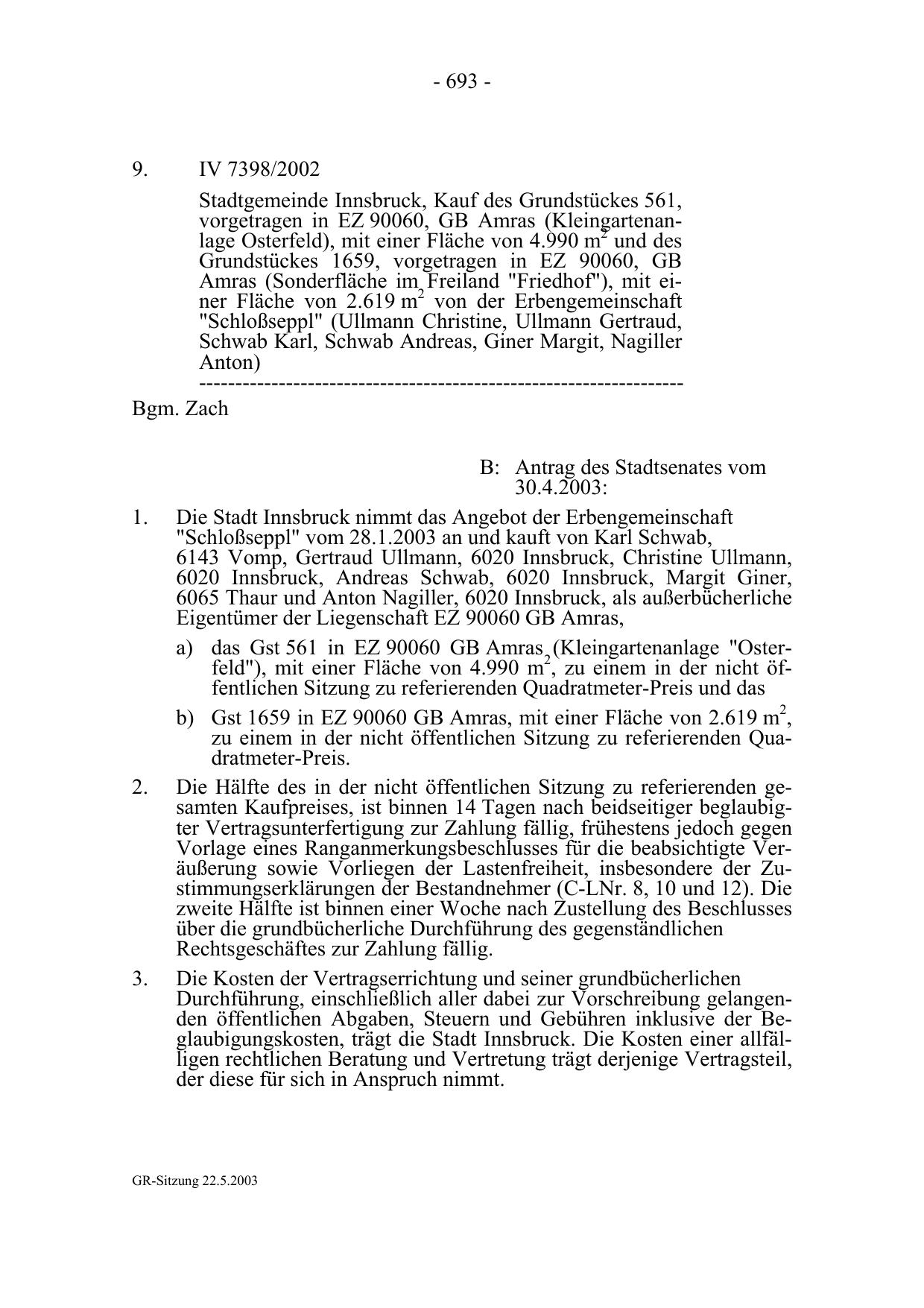 a) das Gst 561 in EZ 90060 GB Amras2 (Kleingartenanlage "Osterfeld"), mit einer Fläche von 4.990 m , zu einem in der nicht öffentlichen Sitzung zu referierenden Quadratmeter-Preis und das