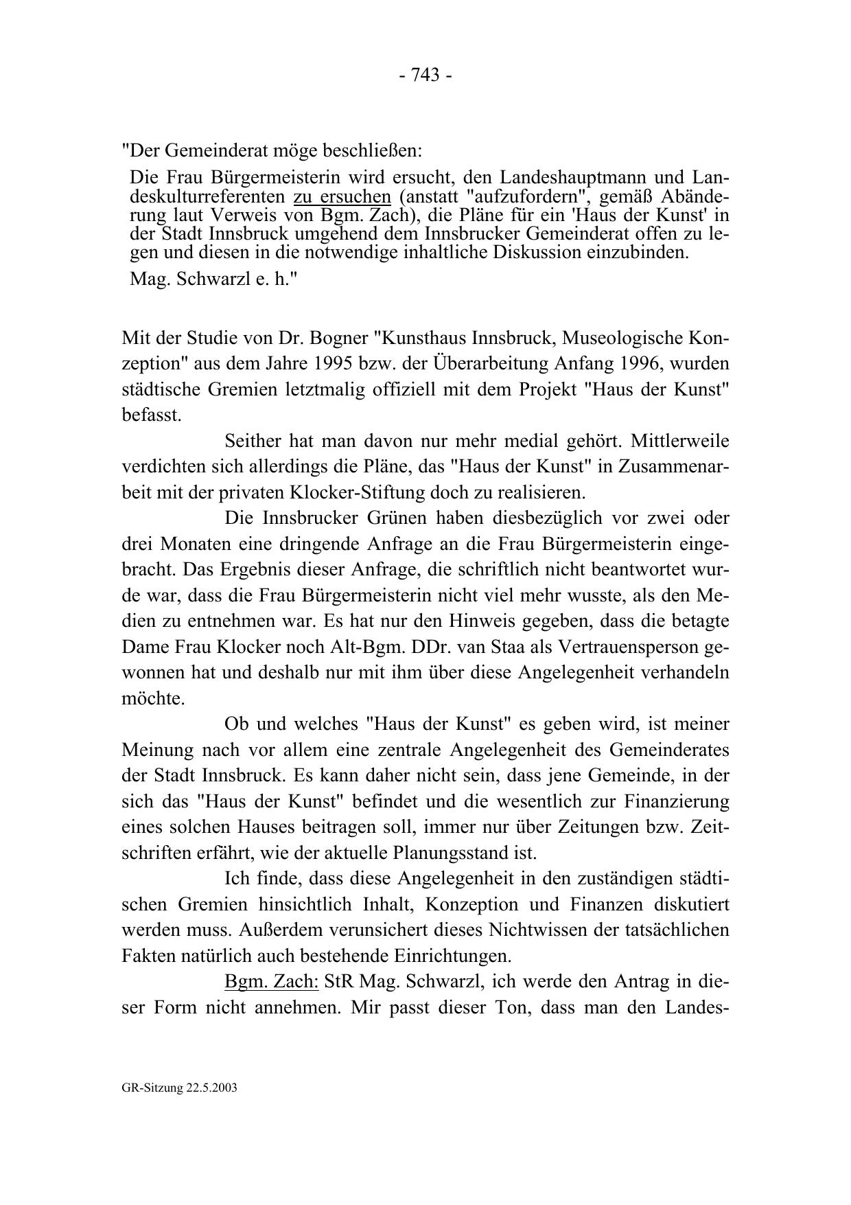 Die Frau Bürgermeisterin wird ersucht, den Landeshauptmann und Landeskulturreferenten zu ersuchen (anstatt "aufzufordern", gemäß Abänderung laut Verweis von Bgm. Zach), die Pläne für ein "Haus der Kunst" in