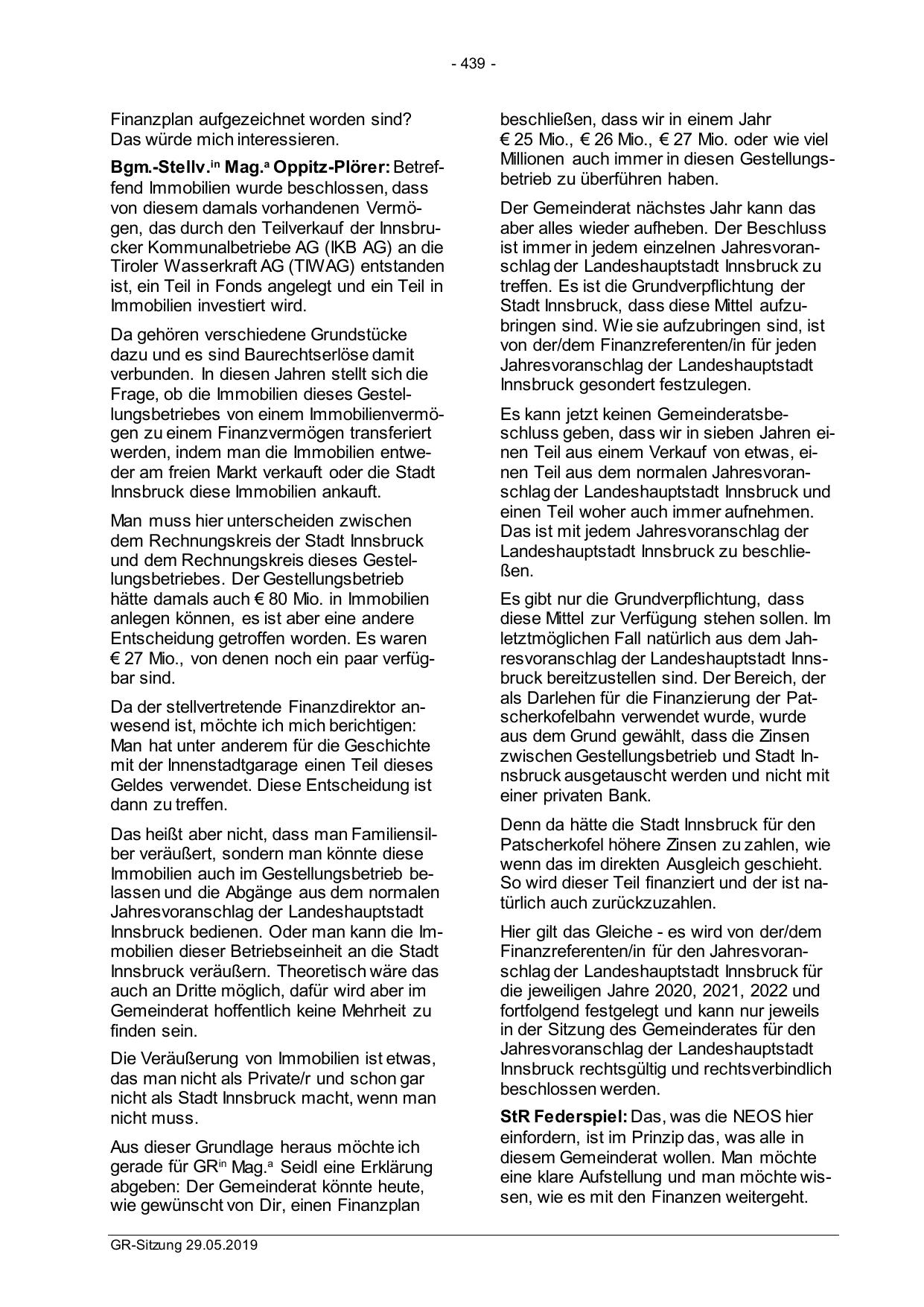 Es kann jetzt keinen Gemeinderatsbeschluss geben, dass wir in sieben Jahren einen Teil aus einem Verkauf von etwas, einen Teil aus dem normalen Jahresvoranschlag der Landeshauptstadt Innsbruck und