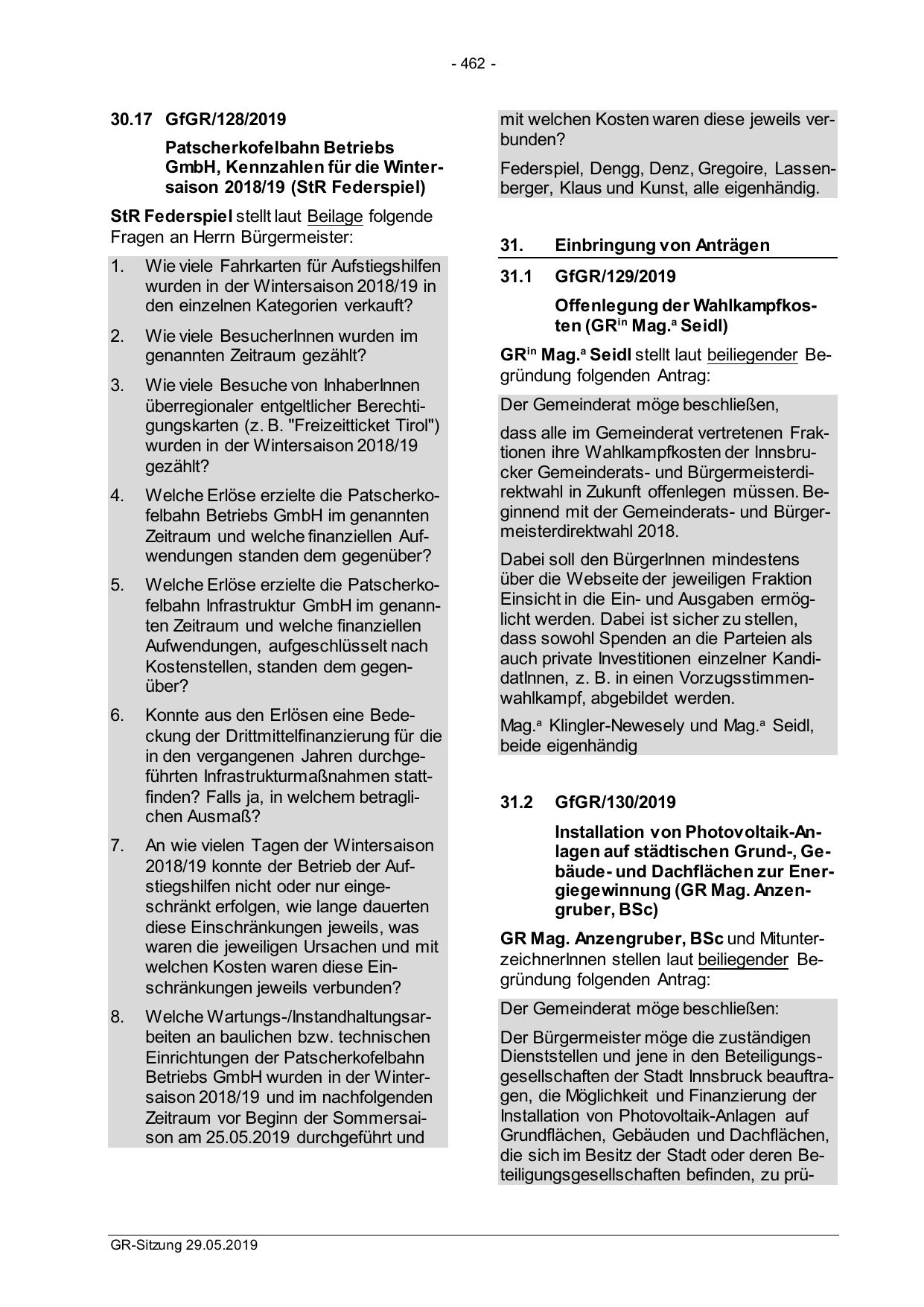 dass alle im Gemeinderat vertretenen Fraktionen ihre Wahlkampfkosten der lnnsbrucker Gemeinderats- und Bürgermeisterdirektwahl in Zukunft offenlegen müssen. Beginnend mit der Gemeinderats- und Bürgermeisterdirektwahl 2018.