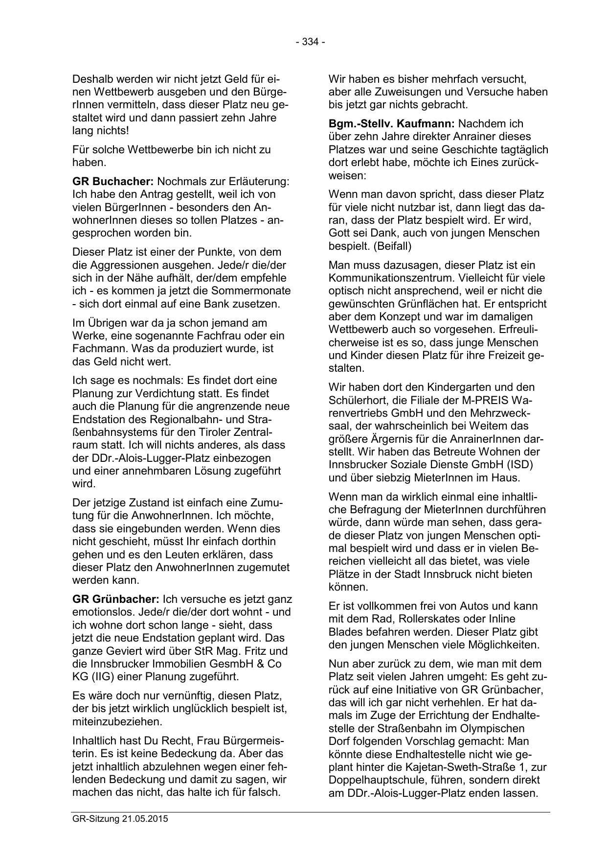 vielen BürgerInnen - besonders den AnwohnerInnen dieses so tollen Platzes - angesprochen worden bin.