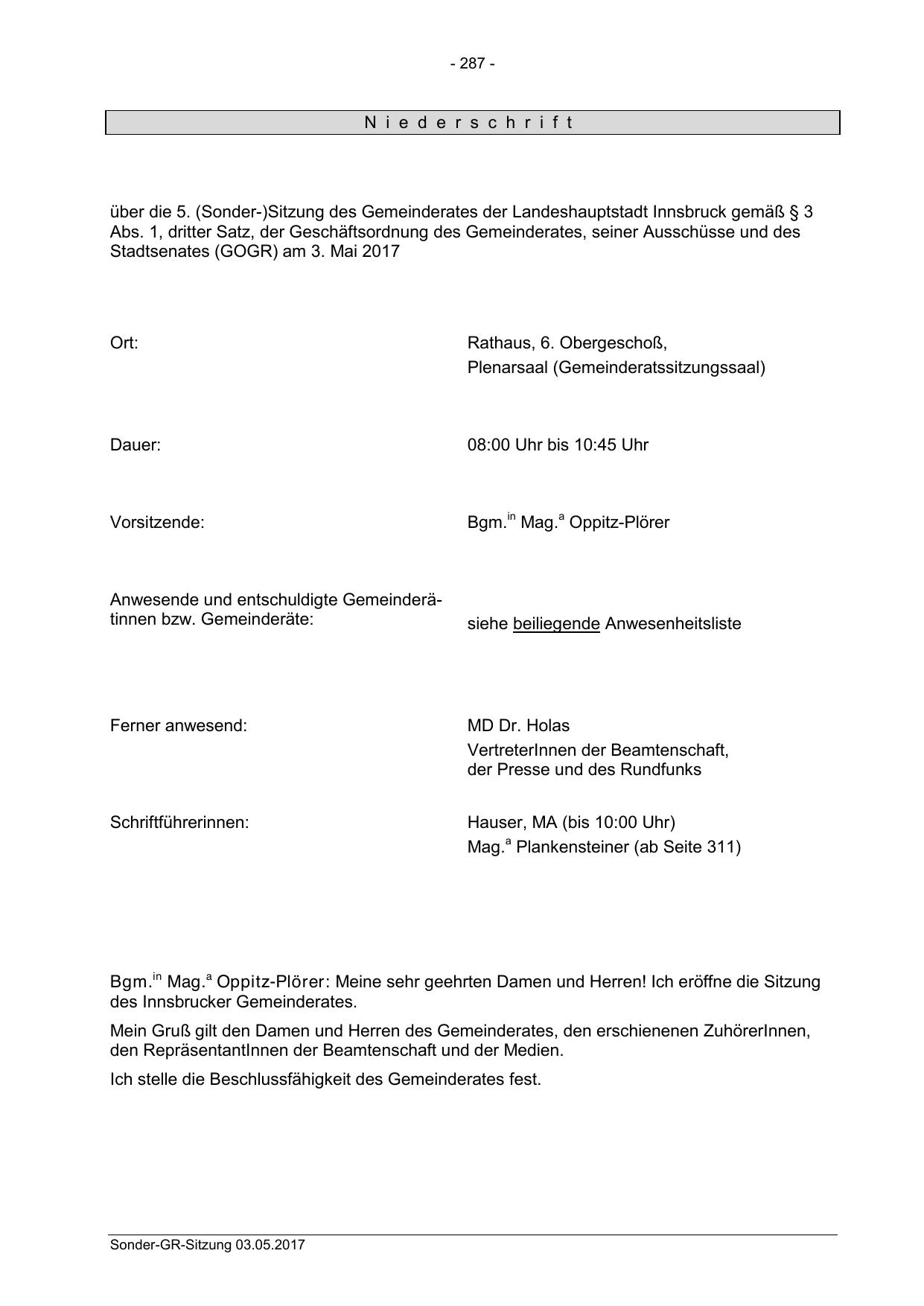 über die 5. (Sonder-)Sitzung des Gemeinderates der Landeshauptstadt Innsbruck gemäß § 3