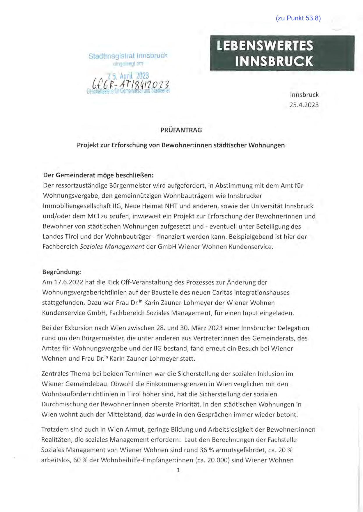 und/oder dem MCI zu prüfen, inwieweit ein Projekt zur Erforschung der Bewohnerinnen und