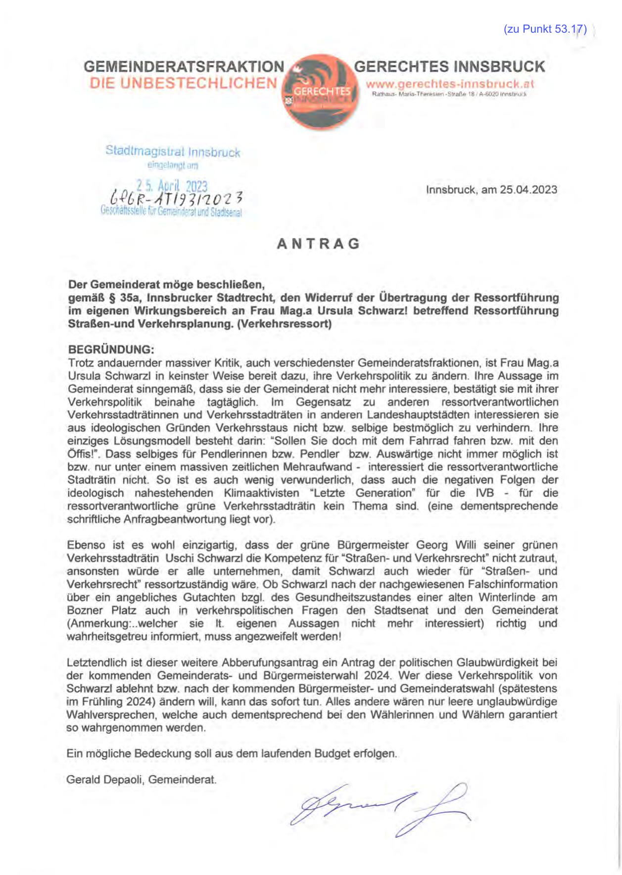 gemäß § 35a, lnnsbrucker Stadtrecht, den Widerruf der Übertragung der Ressortführung