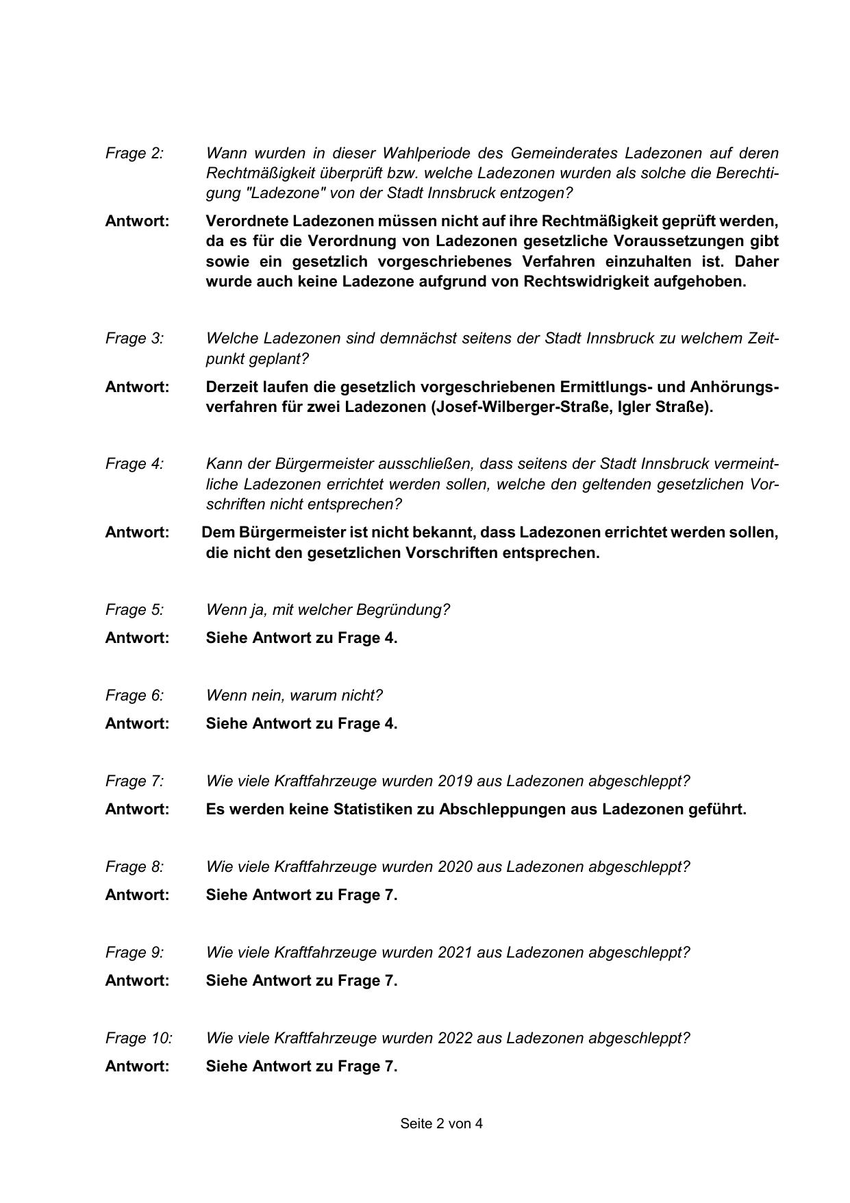 Kann der Bürgermeister ausschließen, dass seitens der Stadt Innsbruck vermeintliche Ladezonen errichtet werden sollen, welche den geltenden gesetzlichen Vorschriften nicht entsprechen?