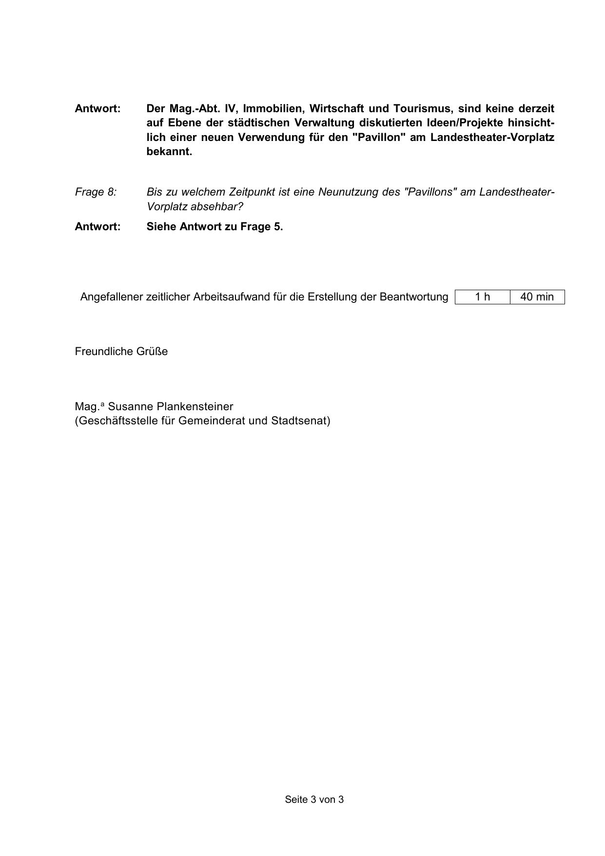 Bis zu welchem Zeitpunkt ist eine Neunutzung des "Pavillons" am LandestheaterVorplatz absehbar?