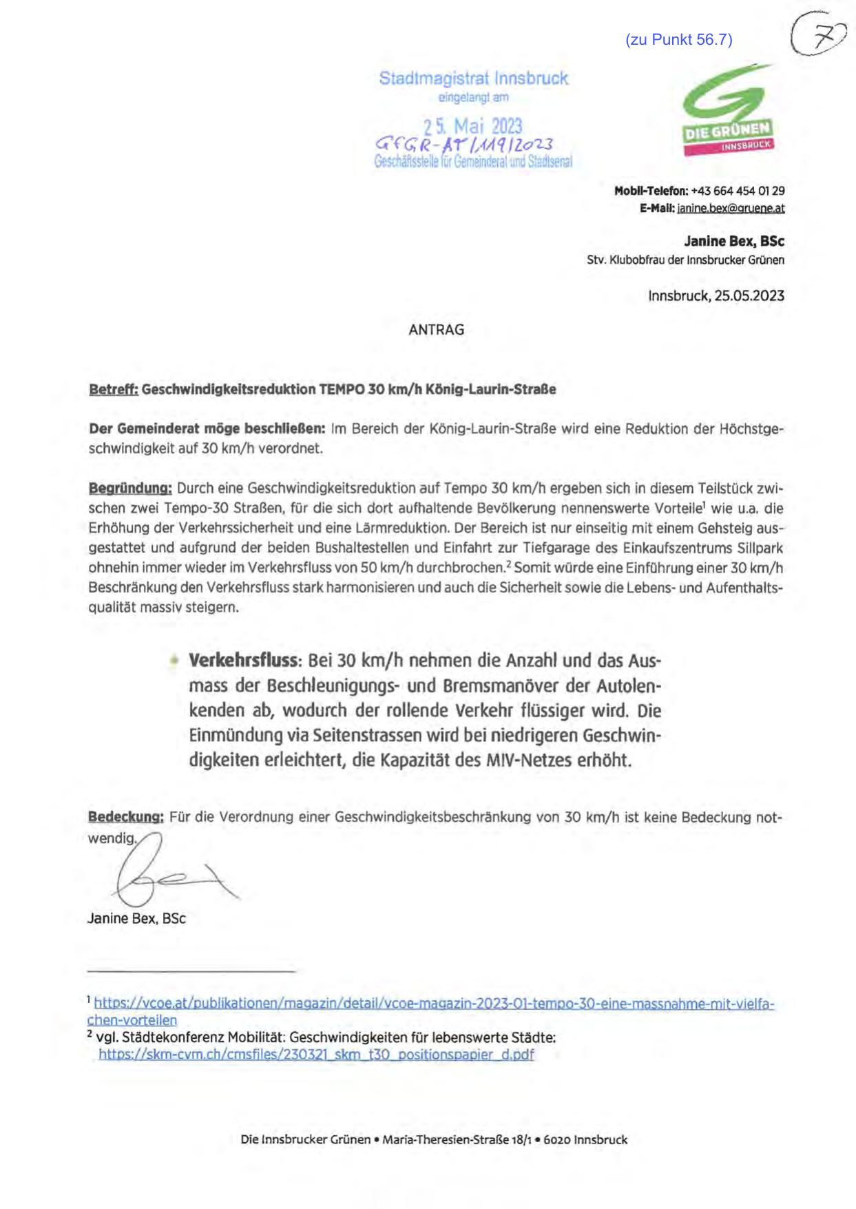Der Gemeinderat möge beschließen: Im Bereich der König-Laurin-Straße wird eine Reduktion der Höchstgeschwindigkeit auf 30 km/h verordnet.
