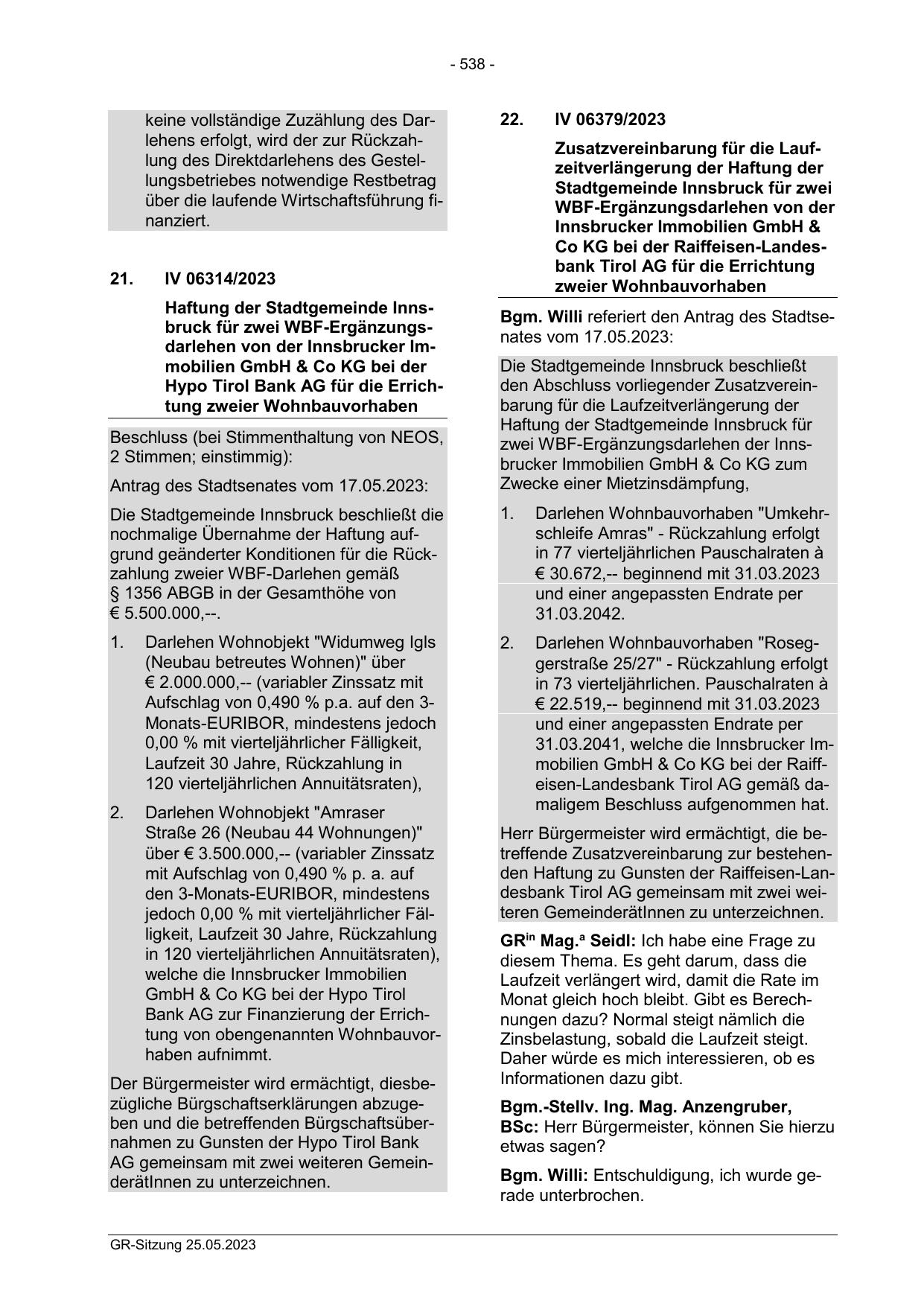 Der Bürgermeister wird ermächtigt, diesbezügliche Bürgschaftserklärungen abzugeben und die betreffenden Bürgschaftsübernahmen zu Gunsten der Hypo Tirol Bank