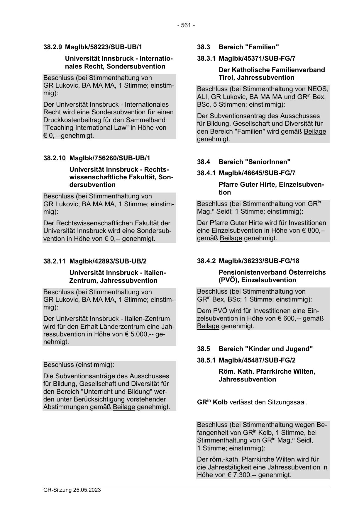Mag.a Seidl; 1 Stimme; einstimmig):