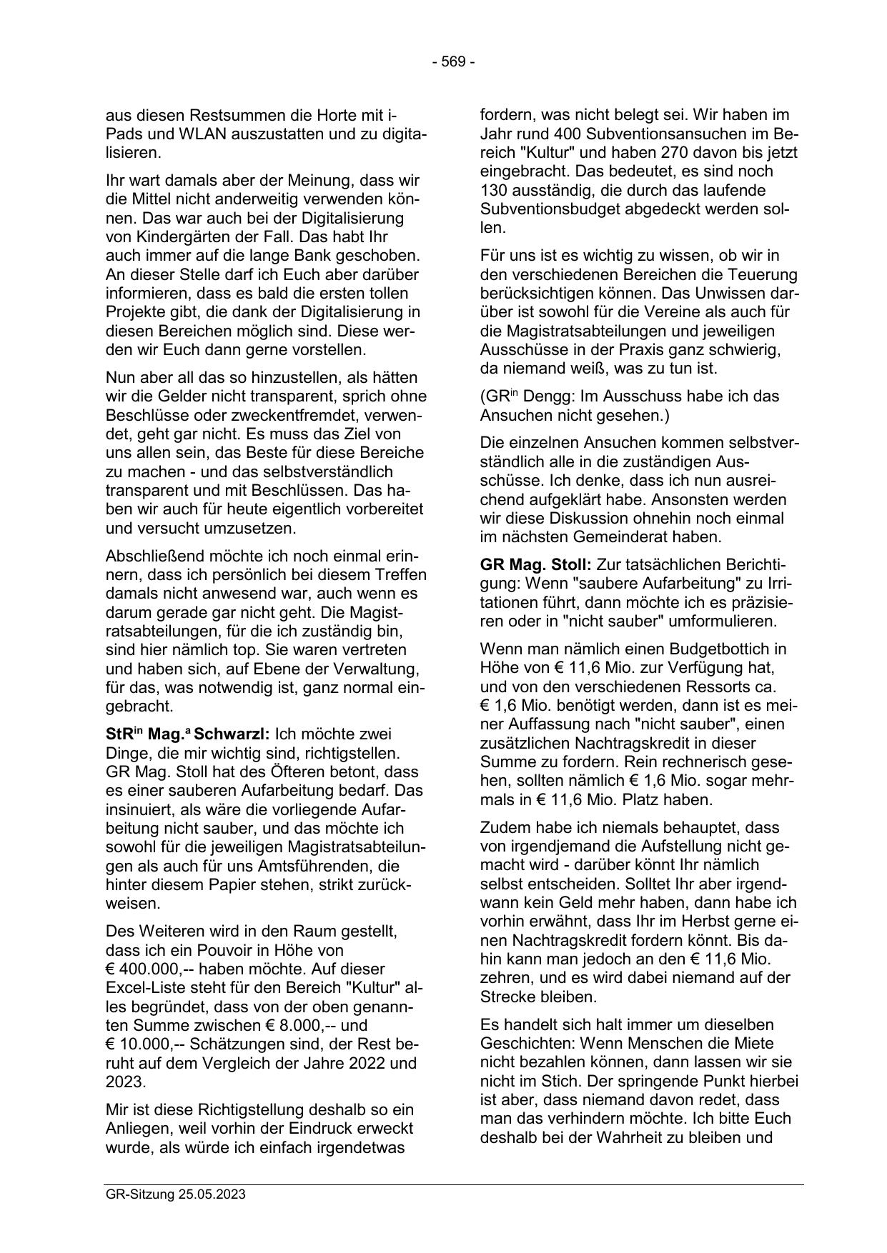 vorhin erwähnt, dass Ihr im Herbst gerne einen Nachtragskredit fordern könnt. Bis dahin kann man jedoch an den € 11,6 Mio.