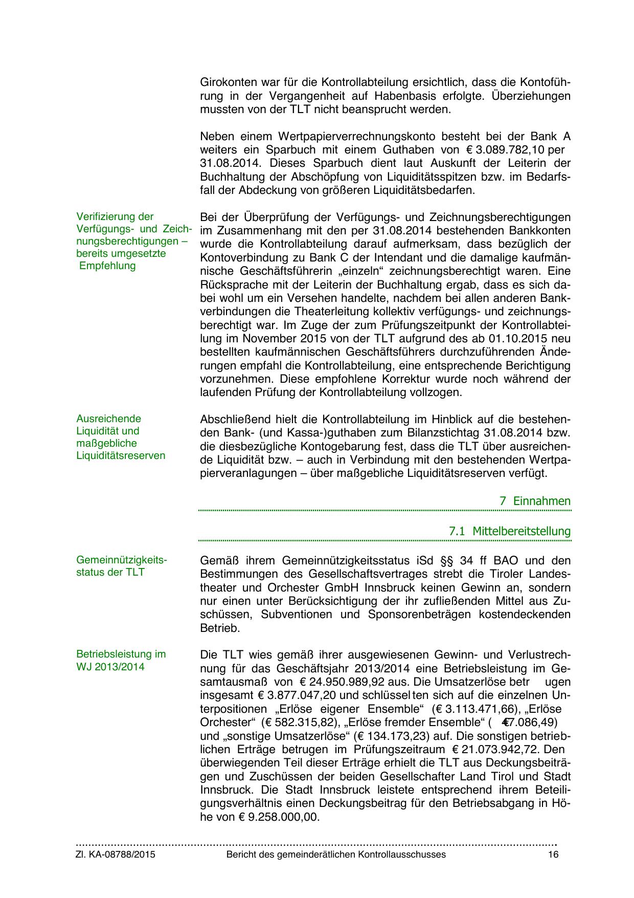Rücksprache mit der Leiterin der Buchhaltung ergab, dass es sich dabei wohl um ein Versehen handelte, nachdem bei allen anderen Bankverbindungen die Theaterleitung kollektiv verfügungs- und zeichnungsberechtigt war. Im Zuge der zum Prüfungszeitpunkt der Kontrollabteilung im November 2015 von der TLT aufgrund des ab 01.10.2015 neu