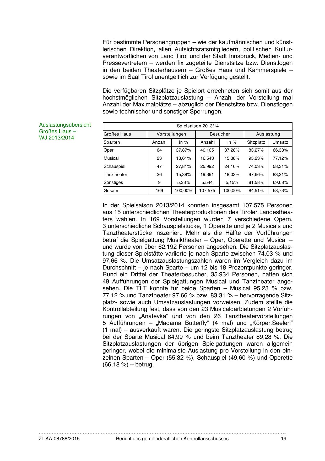 und wurde von über 62.192 Personen angesehen. Die Sitzplatzauslastung dieser Spielstätte variierte je nach Sparte zwischen 74,03 % und