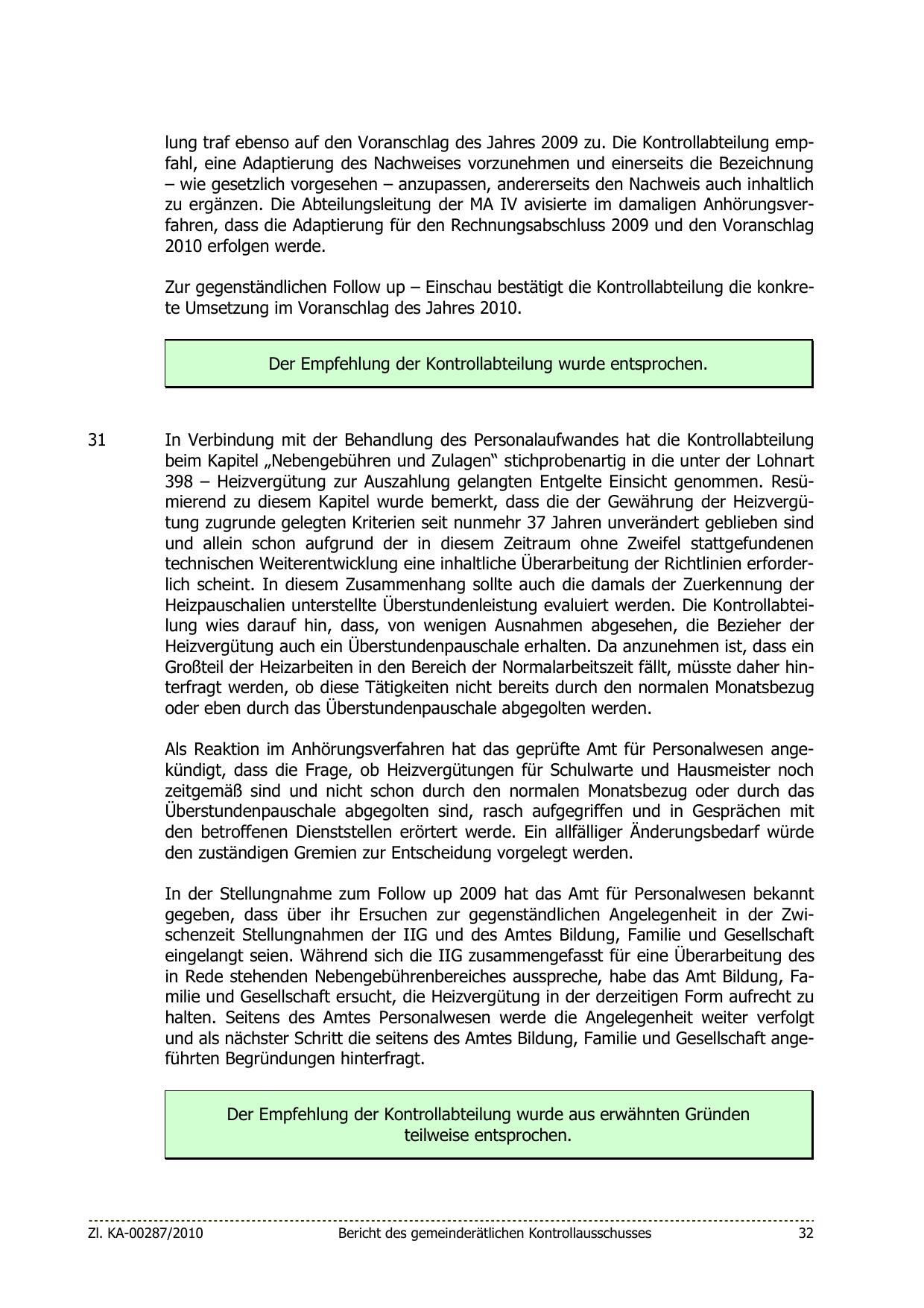 Zur gegenständlichen Follow up – Einschau bestätigt die Kontrollabteilung die konkrete Umsetzung im Voranschlag des Jahres 2010.