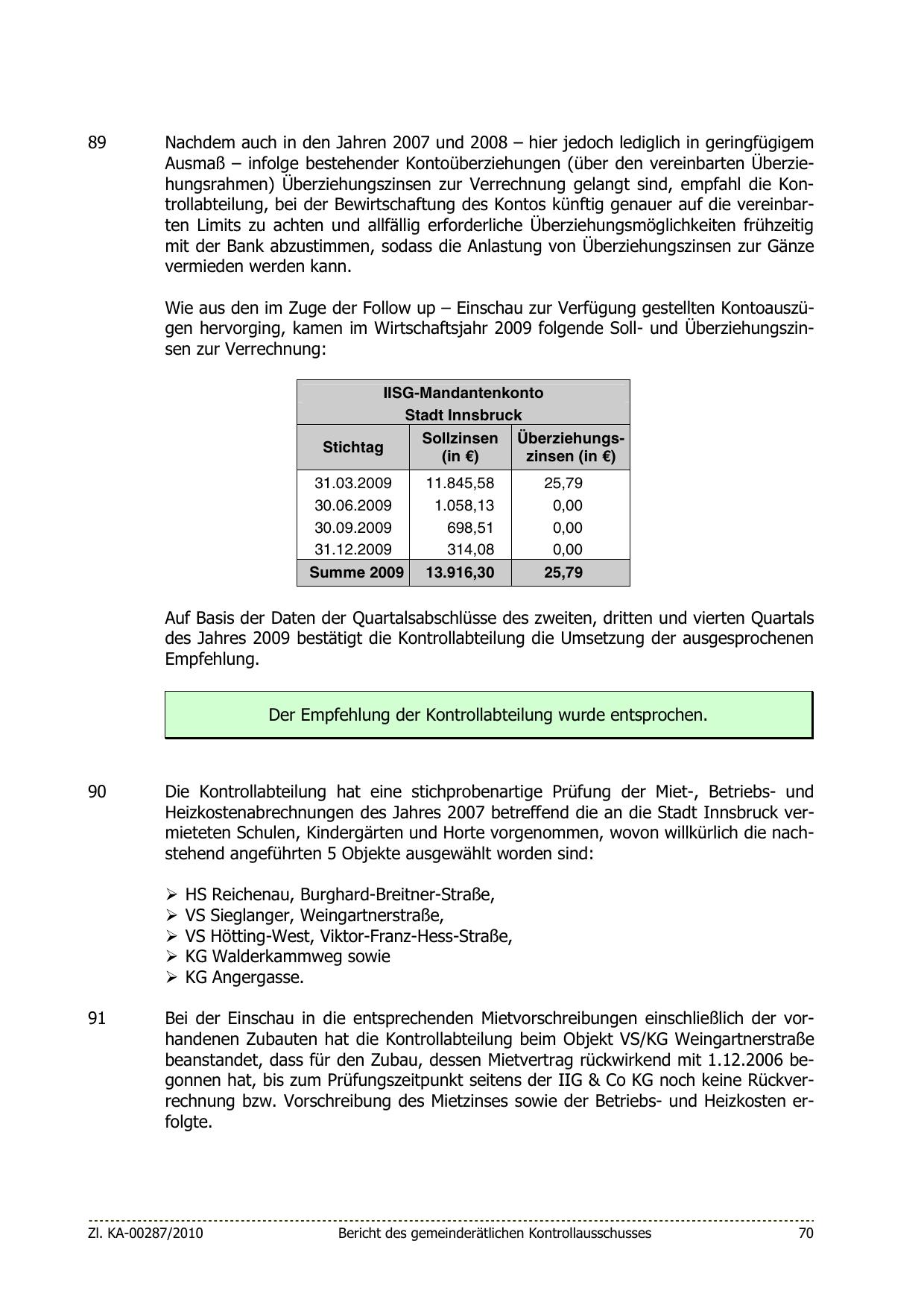 Wie aus den im Zuge der Follow up – Einschau zur Verfügung gestellten Kontoauszügen hervorging, kamen im Wirtschaftsjahr 2009 folgende Soll- und Überziehungszinsen zur Verrechnung: