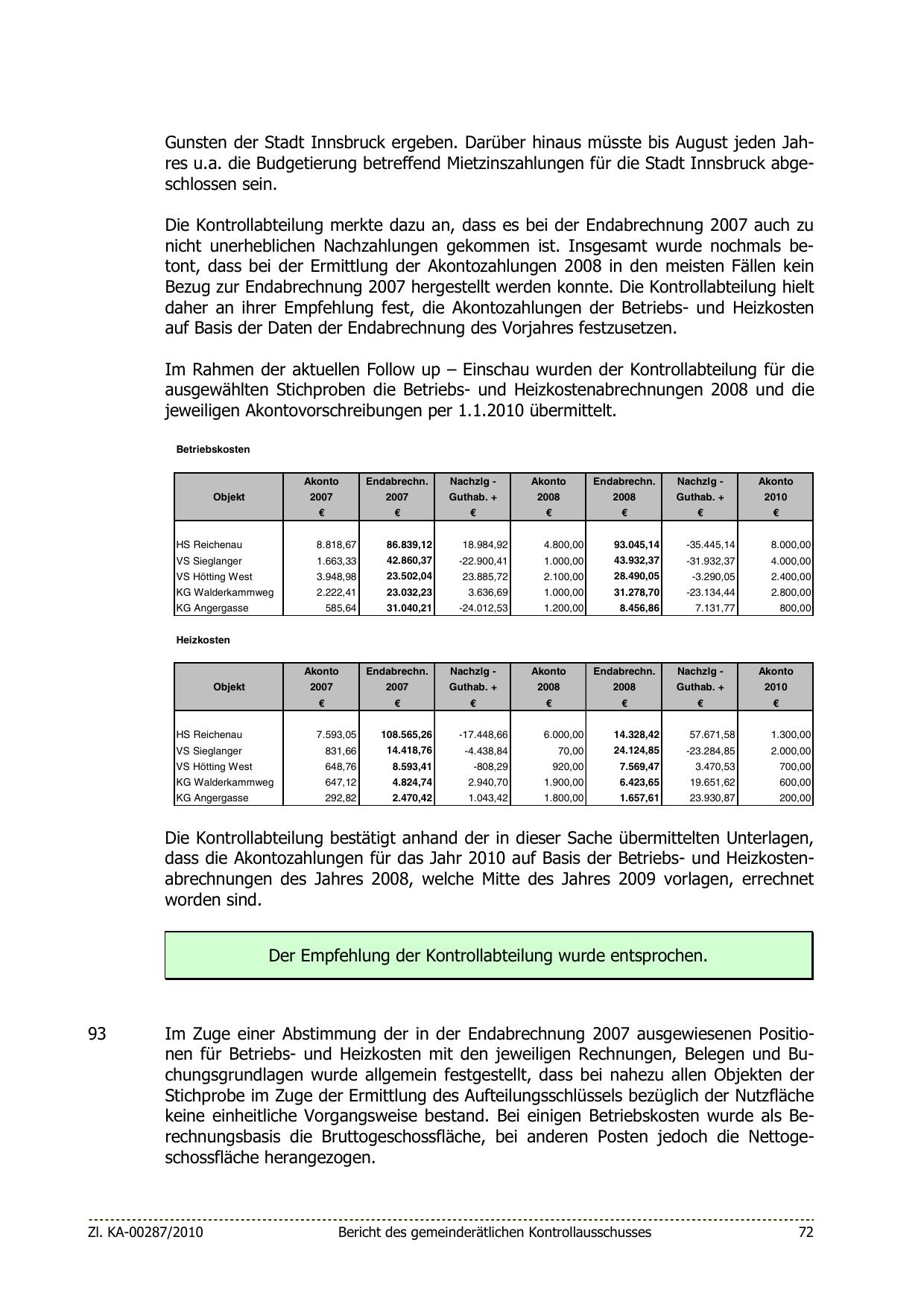 Im Zuge einer Abstimmung der in der Endabrechnung 2007 ausgewiesenen Positionen für Betriebs- und Heizkosten mit den jeweiligen Rechnungen, Belegen und Buchungsgrundlagen wurde allgemein festgestellt, dass bei nahezu allen Objekten der