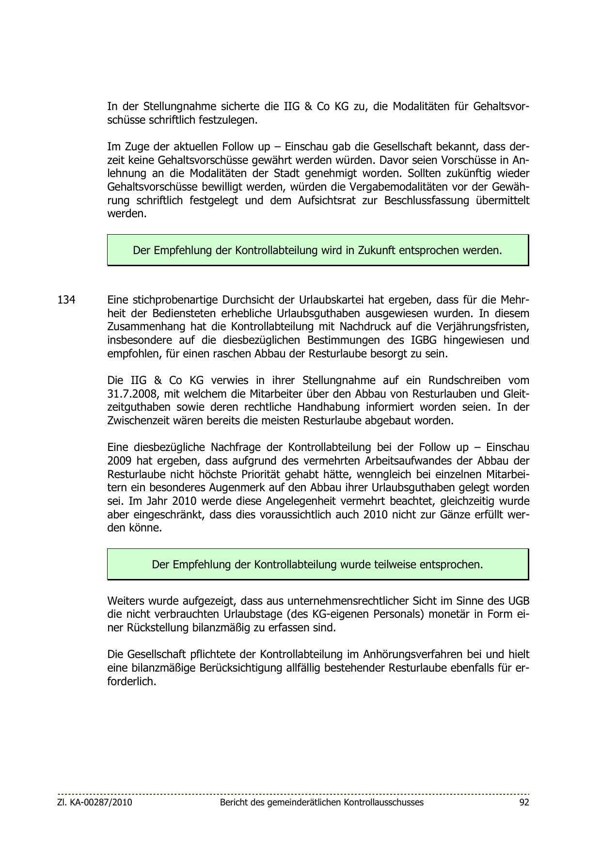 Im Zuge der aktuellen Follow up – Einschau gab die Gesellschaft bekannt, dass derzeit keine Gehaltsvorschüsse gewährt werden würden. Davor seien Vorschüsse in Anlehnung an die Modalitäten der Stadt genehmigt worden. Sollten zukünftig wieder