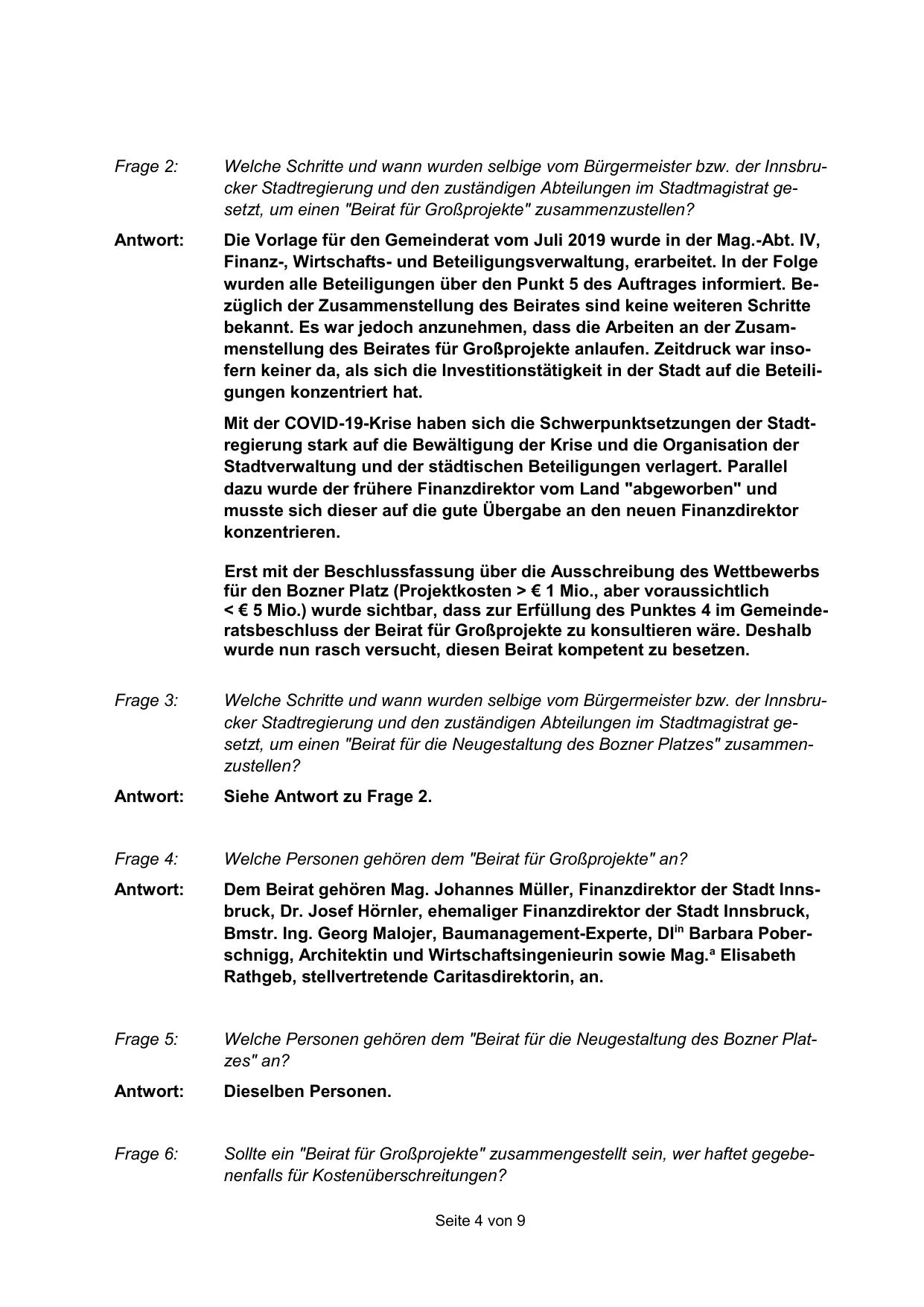 Welche Schritte und wann wurden selbige vom Bürgermeister bzw. der Innsbrucker Stadtregierung und den zuständigen Abteilungen im Stadtmagistrat gesetzt, um einen "Beirat für Großprojekte" zusammenzustellen?