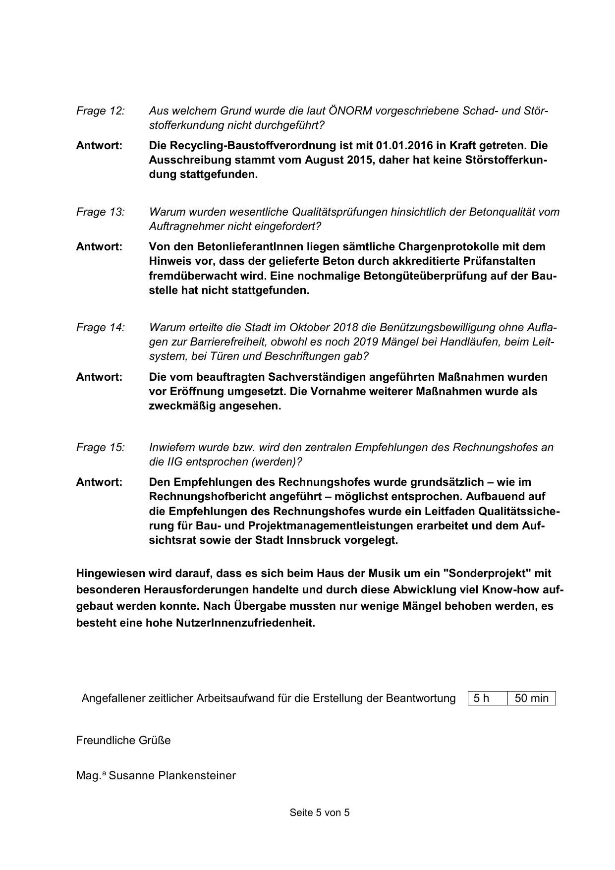 Angefallener zeitlicher Arbeitsaufwand für die Erstellung der Beantwortung